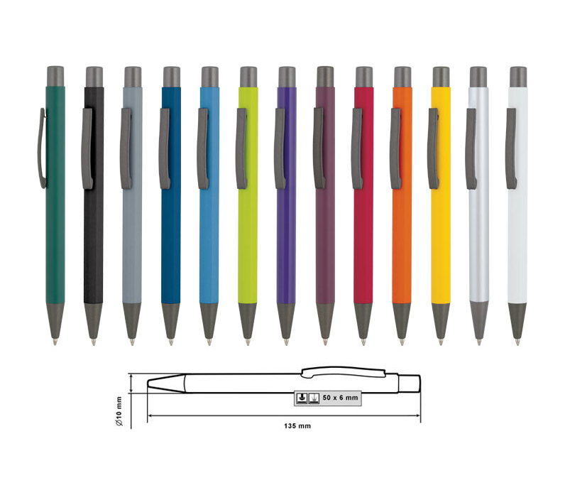 Химикалка, пълнител тип паркер. Материал: метал. Размер на артикула: Ø10х135 mm. Печатаемо поле: 50х6 mm. Печат: тампонен, ситопечат, гравиране. Опаковка: 500 бр. в кашон.