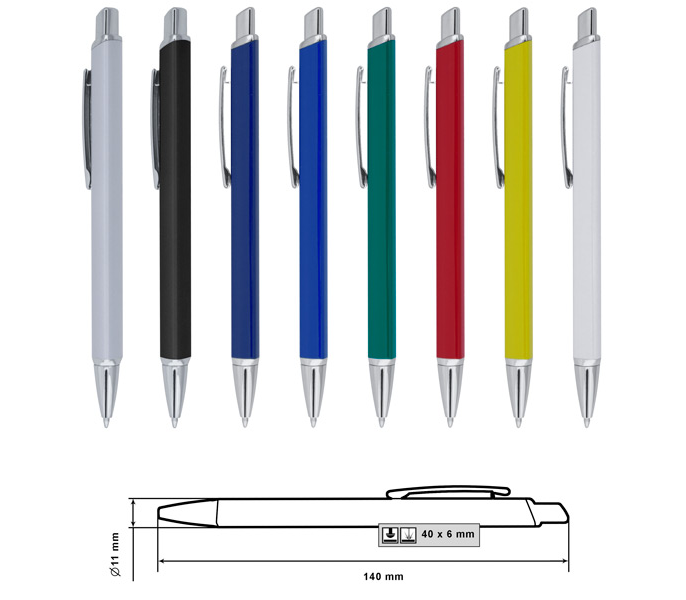 Химикалка, пълнител обикновен. Материал: метал. Размер на артикула: Ø11х140 mm. Печатаемо поле: 40х6 mm. Печат: тампонен, ситопечат, гравиране. Опаковка: 500 бр. в кашон
