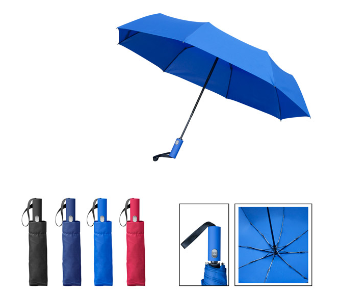 Сгъваем автоматичен чадър (отваряне/затваряне), 8 панелен, метална конструкция, гумирана дръжка. Материал: понджи 190T. Размер на артикула: Ø1000x650 mm. Печатаемо поле: 200х100 mm. Печат: директен ситопечат.