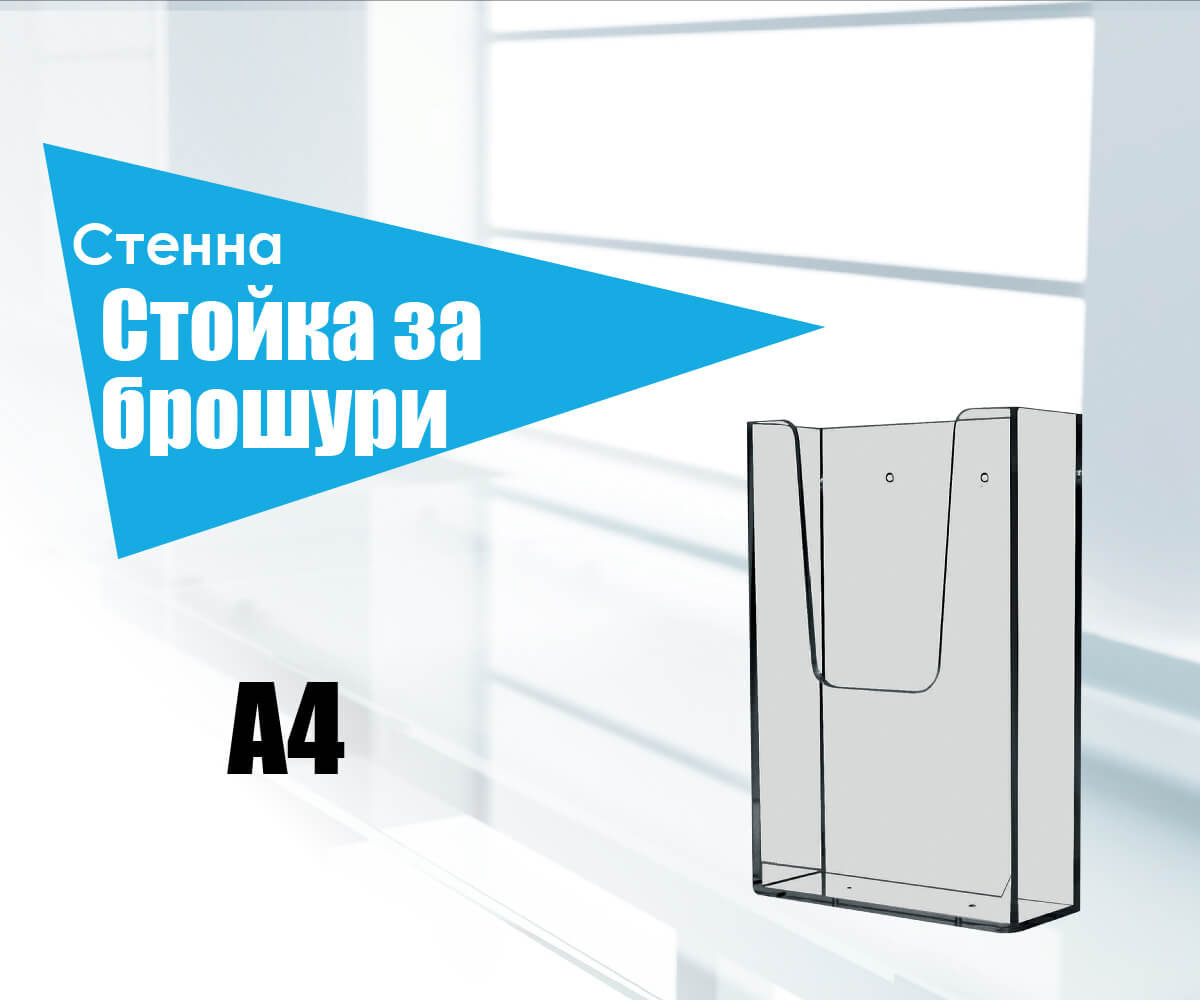 Стенна поставка за брошури/дипляни А4. Материал: прозрачен плексиглас, 2 мм