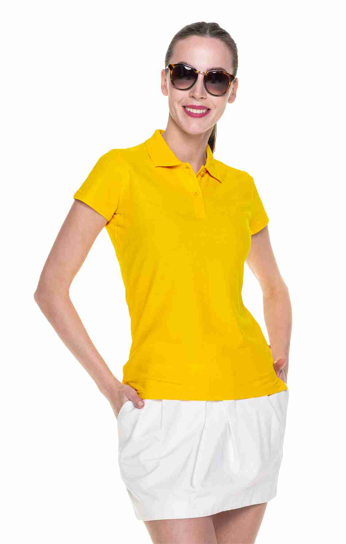 Дамска блуза от пике плат, съставен от 90% пениран памук и 10% полиестер. Само цвят 48 се състои от 70% памук и 30% полиестер. Моделът е втален и подчертава талията. Яката е плоска с двойни структурни ивици. Блузата е подсилена с двоен шев, с цепки от двете страни, копчетата са в същия цвят. Плътността на трикото осигурява комфорт и безупречна визия. Продукт, способен да задоволи очакванията и на най-взискателния клиент.