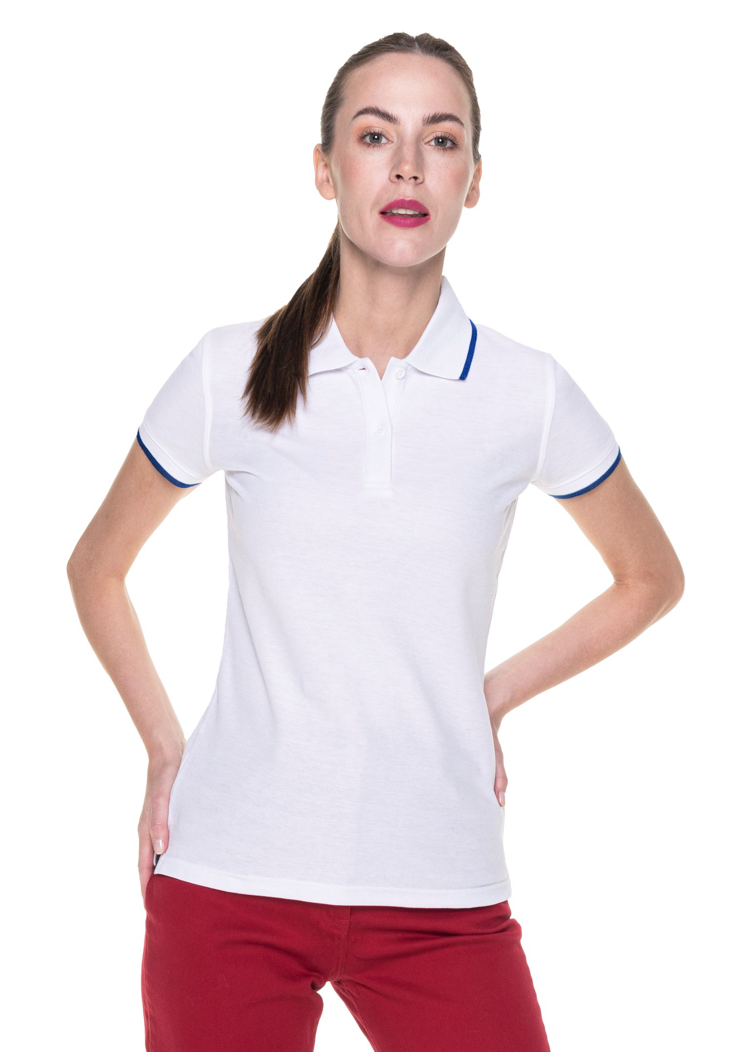 Елегантна дамска поло блуза. Впечатление правят декоративните ивици на яката и ръкавите. Блузата е подсилена с двоен шев, с цепки от двете страни, има плоска якичка и три копчета в същия цвят. Вталената кройка придава безупречна визия на дамите. Изключително подходяща както за фирмено облекло така и за носене в ежедневието.