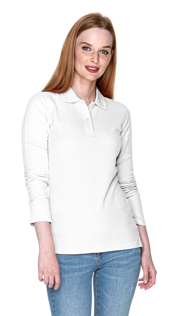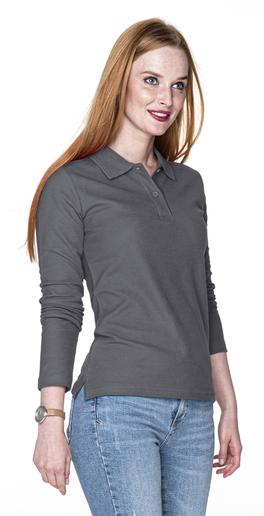 Дамска блуза с дълъг ръкав от пике плат, съставен от 90% пениран памук и 10% полиестер. Моделът е втален и подчертава талията. Яката е плоска с двойни структурни ивици. Блузата е подсилена с двоен шев, с цепки от двете страни, копчетата са в същия цвят. Плътността на трикото осигурява комфорт и безупречна визия. Продукт, способен да задоволи очакванията и на най-взискателния клиент.