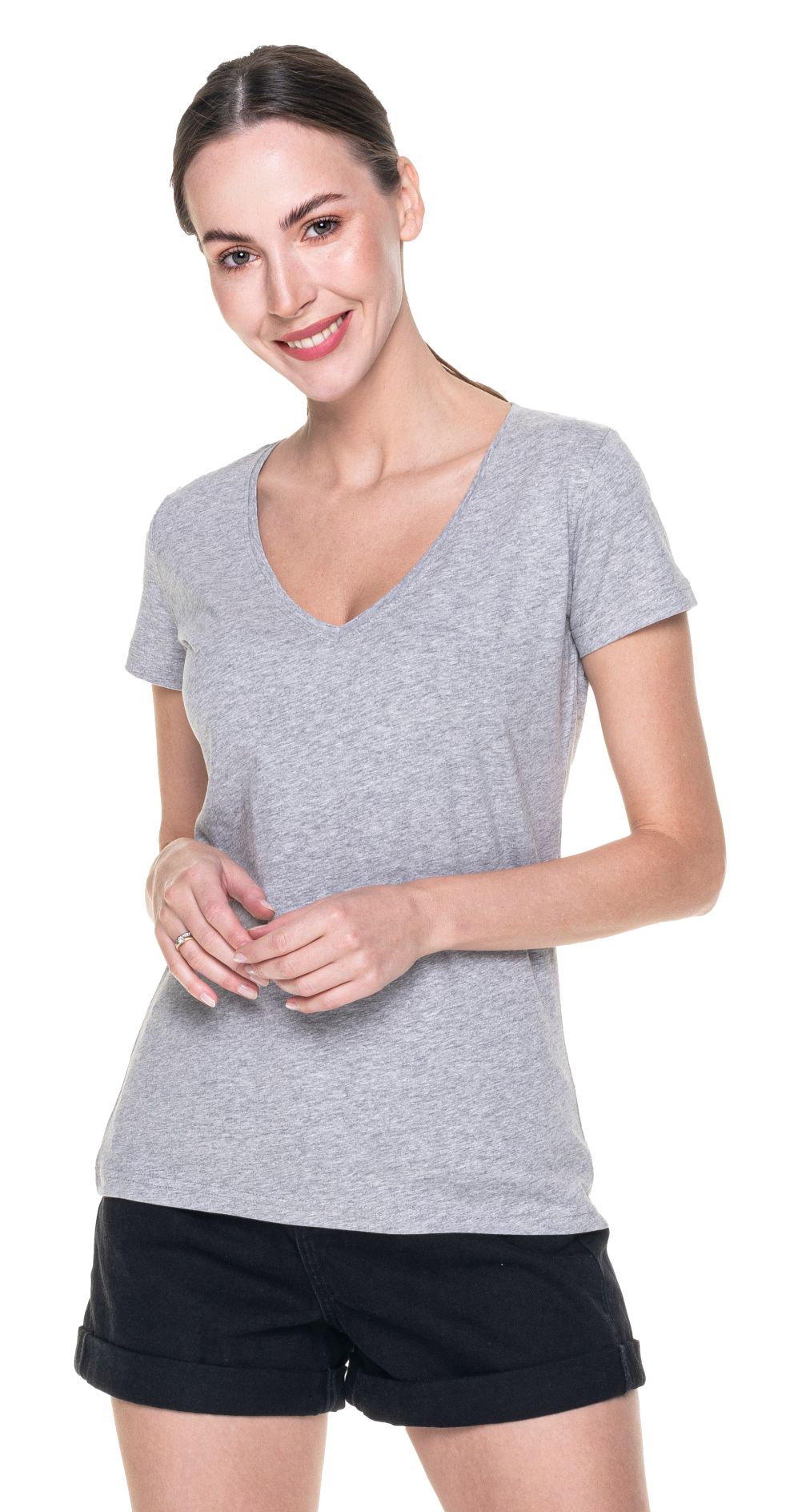 Тениска с V образно деколте. Изключително мека и гладка материя. Дамският модел е с вталена кройка. Тениската е подсилена с двоен шев и с укрепваща лента от рамо до рамо. Не се разтяга и деформира след пране. Подходяща за всякакъв вид печат и бродерия върху текстил.
