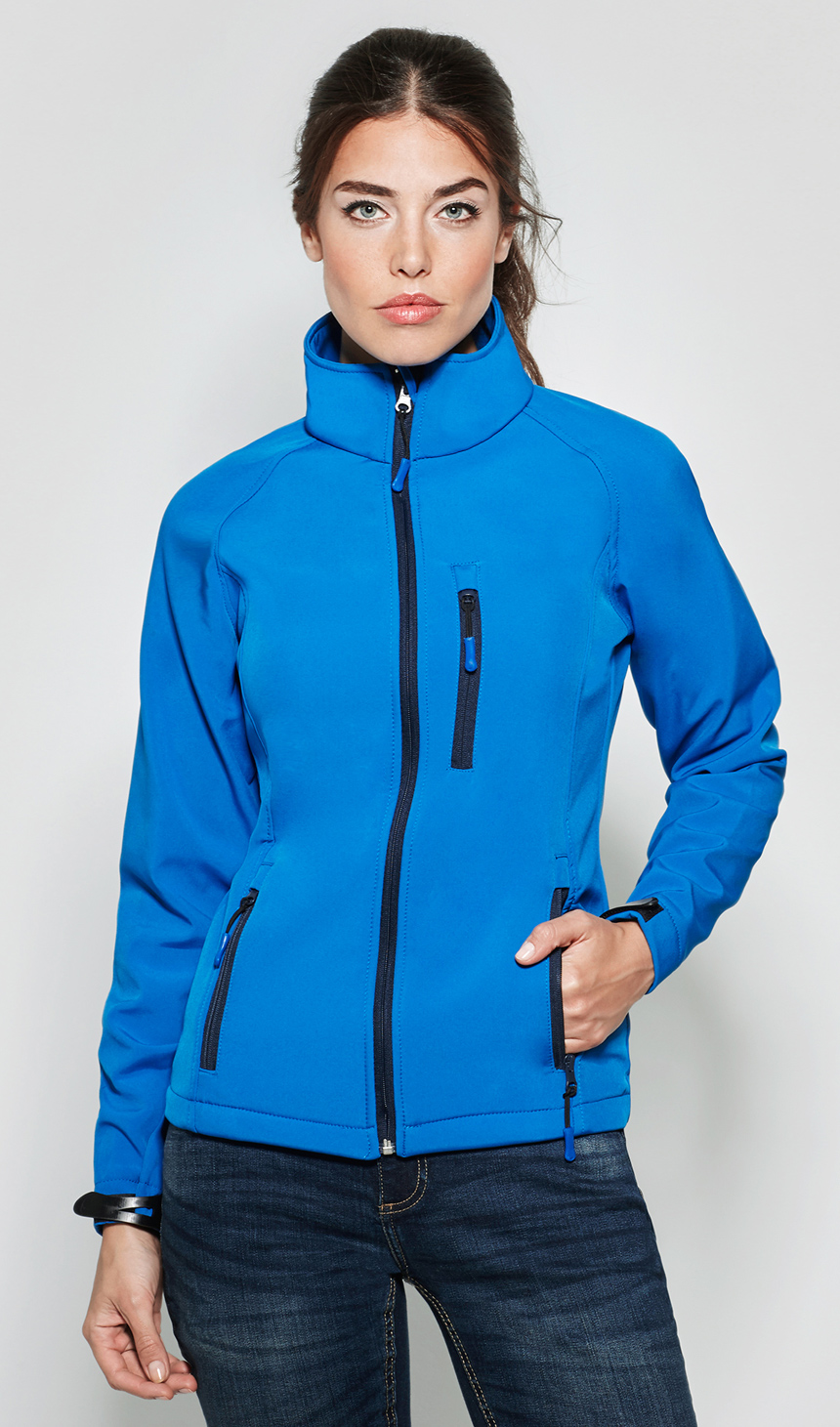 Дамско вталено яке от специален "SoftShell" материал, състоящ се от два слоя. Якето е с цял цип, който завършва с протектор на брадата. Подсилени парчета на гърдите. Три джоба със специални водоустойчиви ципове. Ръкавите завършват с регулируем маншет от каучук в цвета на якето. Долният край на якето има регулируем ластик с два регулатора. Якето е с висока водо и ветроустойчивост.