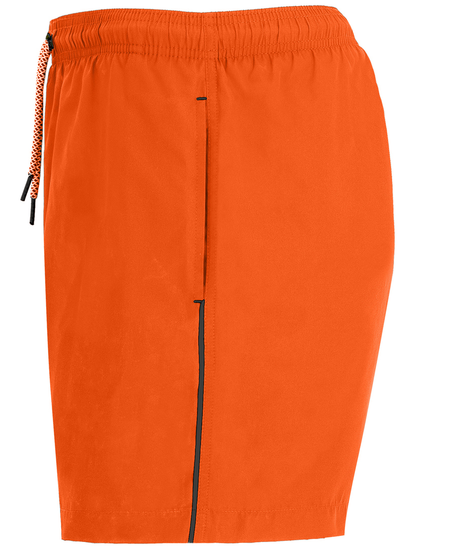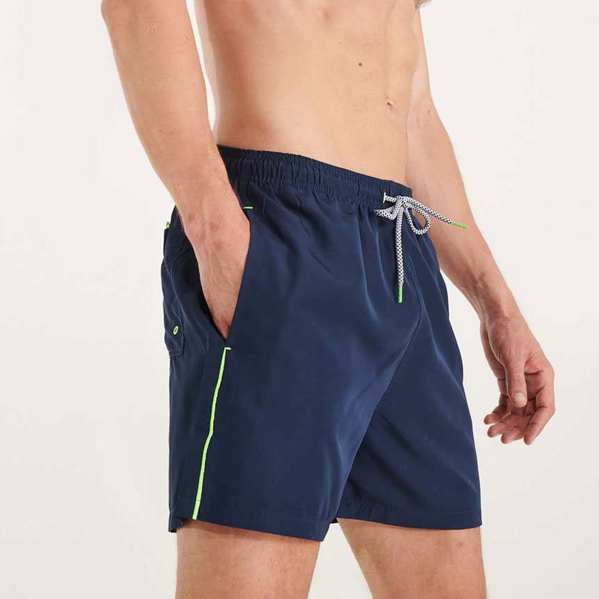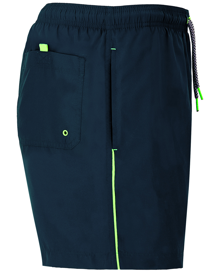 Къси панталони за плуване и спорт от бързо съхнеща полиестърна материя с два странични джоба. Талия с ластик и шарено въже за пристягане минаващо през метални контрастни капси. Отстрани крачолите са с контрастен двоен шев. Отзад имат заден джоб с велкро и капса.