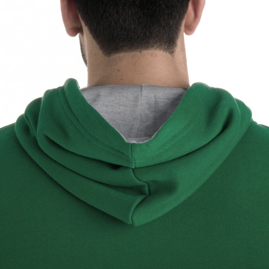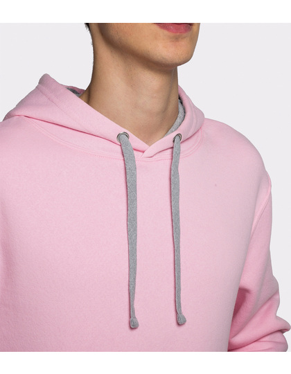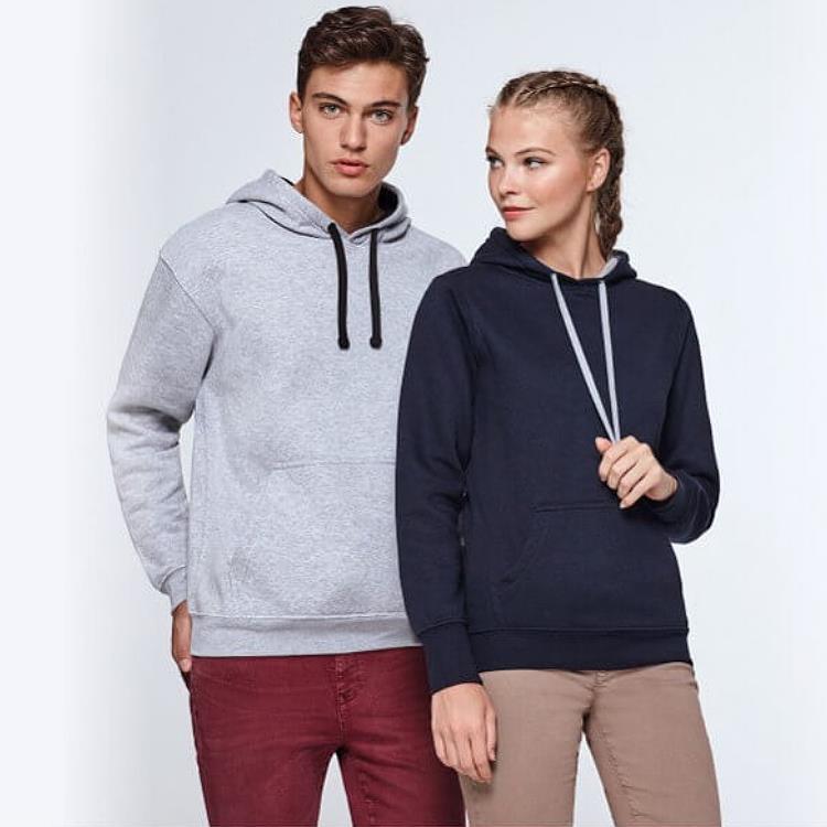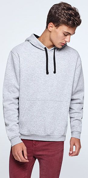Двуцветен мъжки суитчър с джоб тип "кенгуру" и двойна качулка с контрастна подплата и връзка.