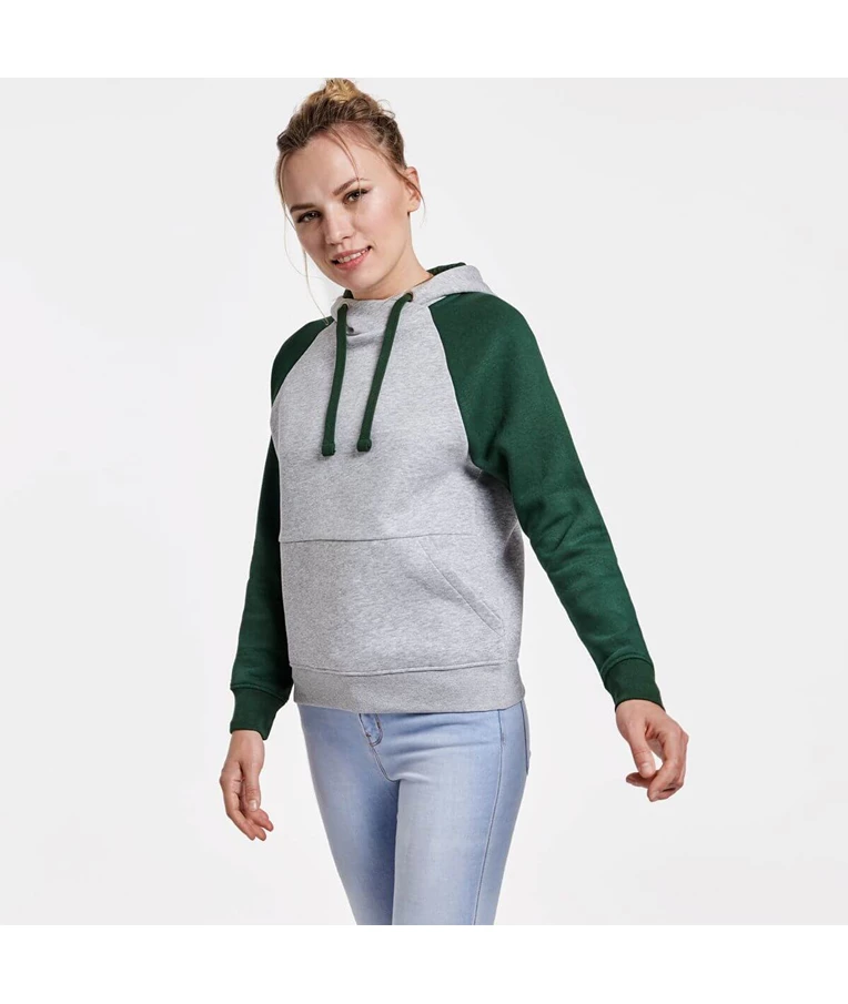 Двуцветен унисекс суичър подходящ за мъже и жени. Качулка с кръстосана яка, контрастна възка и метални капси. Ръкавите и какулката на суитчъра са контрастни. Джоб в стил кенгуру и широк ластик на талията и маншетите.