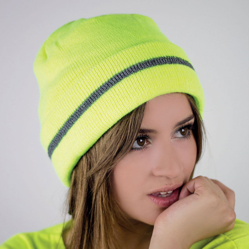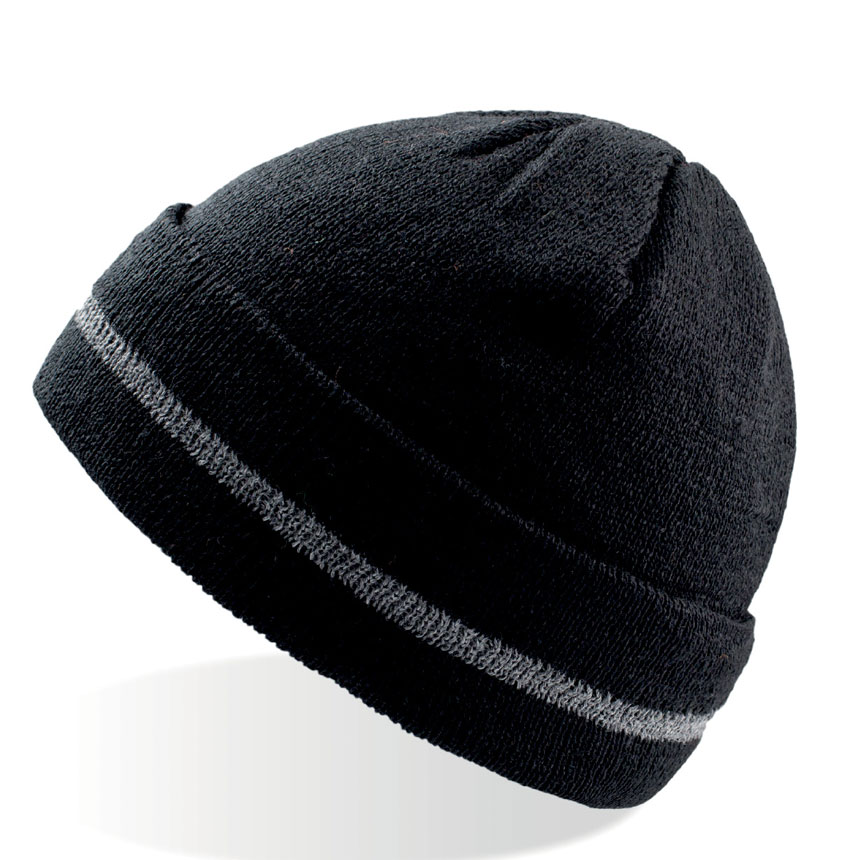 Топла акрилна плетена шапка с отразяваща светлоотразителна лента от сребърна прежда.