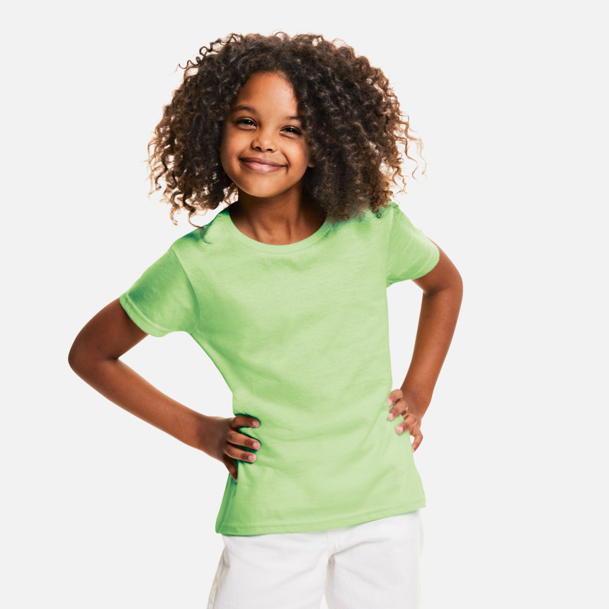 Детска тениска, специално за момичета. Леко вталена, елегантна с обло тънко деколте и къси ръкави. Свободната кройка ви осигурява свобода на движение, а материята - 100% combed ringspun cotton мекота и лекота при носене. Новост за Fruit of the loom е лесния за отстраняване етикет, което прави тениската лесна за Rebranding.