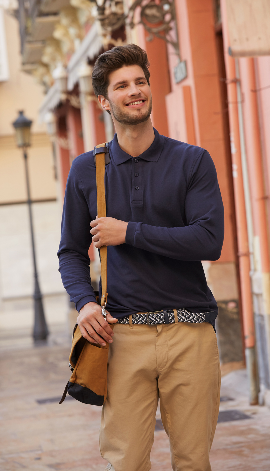 Мъжка луксозна памучна риза поло пике с дълъг ръкав, три копчета и ластик на ръкава в същия цвят.