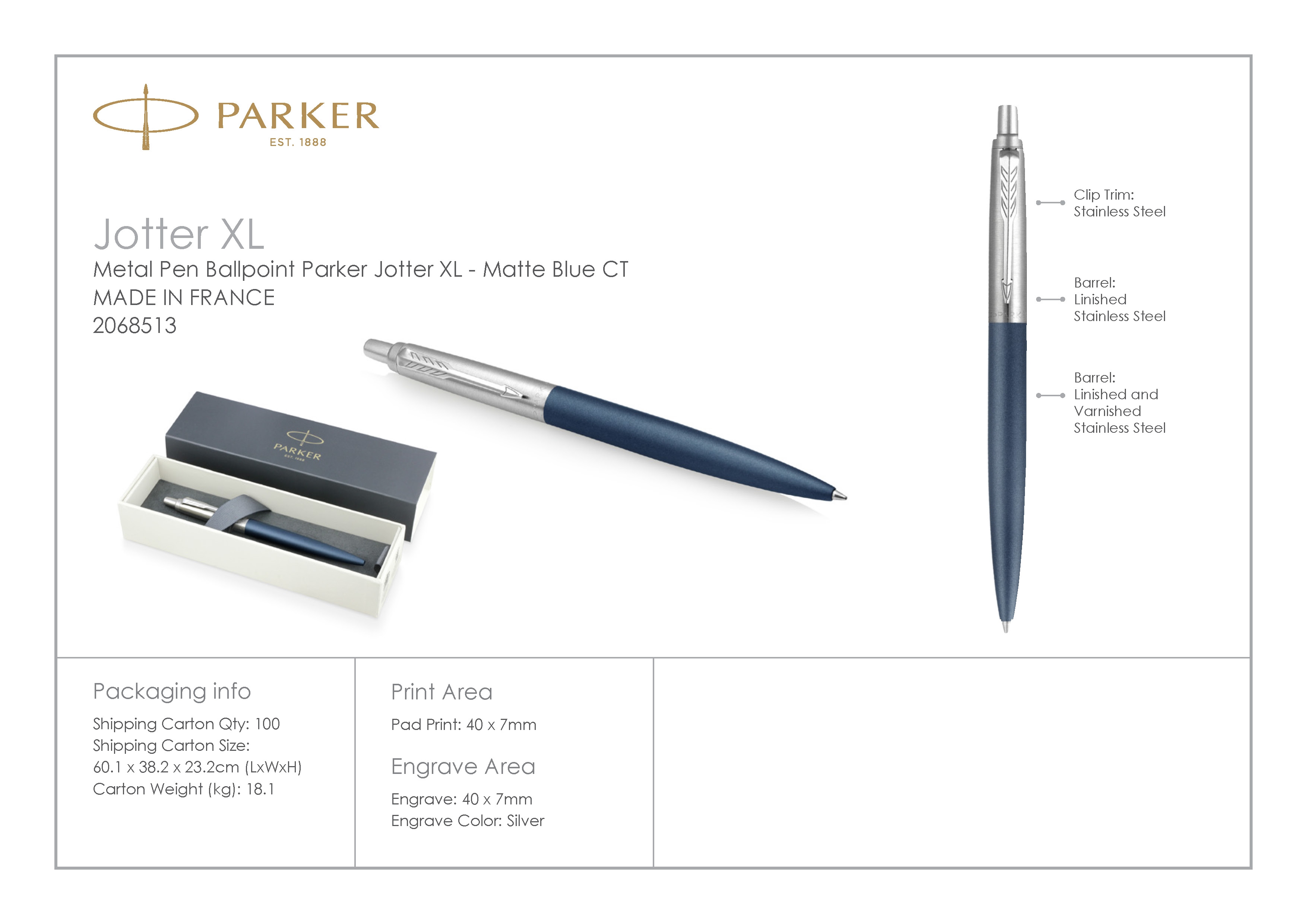 Химикалка Parker Jotter XL е със 7% по-голяма от стандартната Parker Jotter, както с по-дълъг корпус, така и с по-широк захват. Това я прави удобна за задържане при дълги писания.