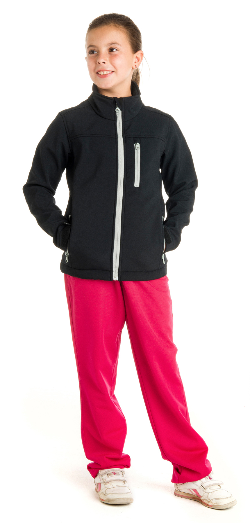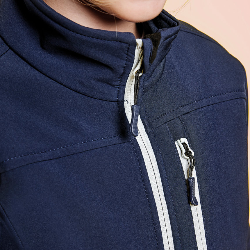 Детско яке от специален "SoftShell" материал, състоящ се от два слоя. Якето е с цял цип, който завършва с протектор на брадата. Подсилени парчета на гърдите. Три джоба със специални водоустойчиви ципове. Ръкавите завършват с регулируем маншет от каучук в цвета на якето. Долният край на якето има регулируем ластик с два регулатора. Якето е с висока водо и ветроустойчивост.