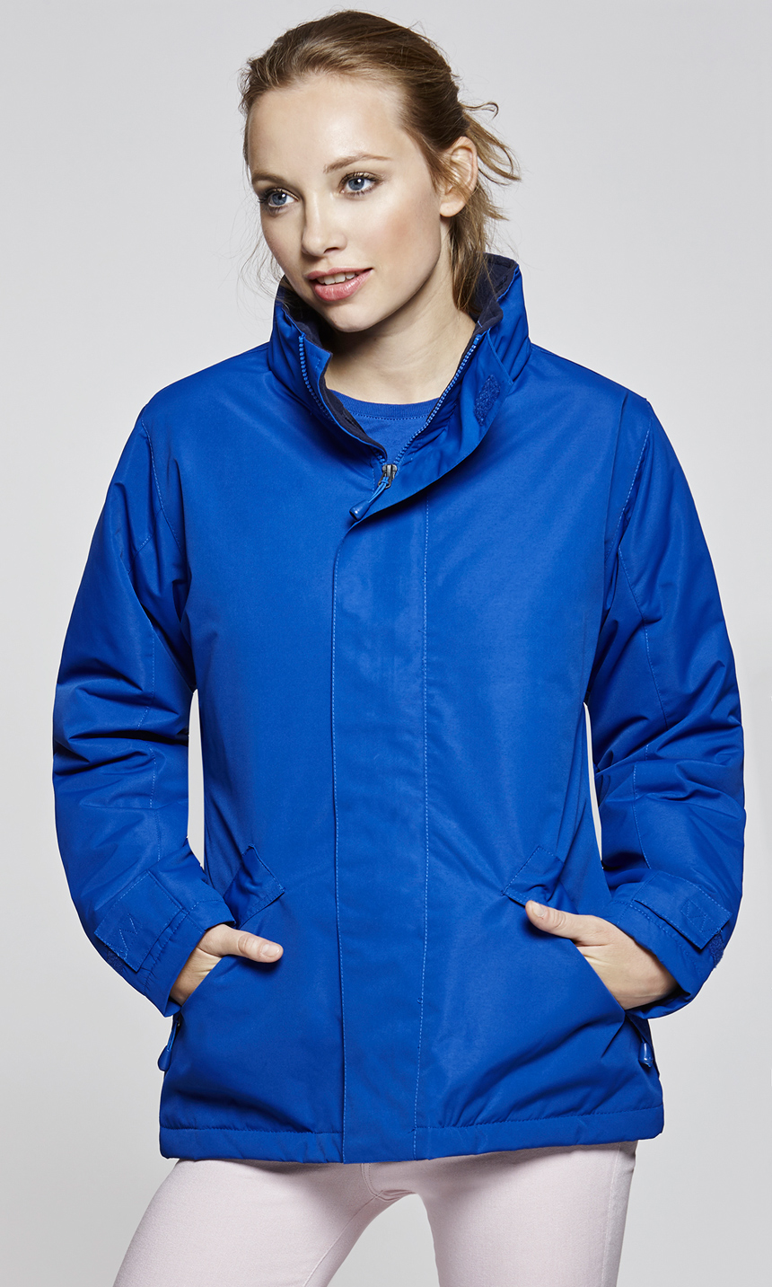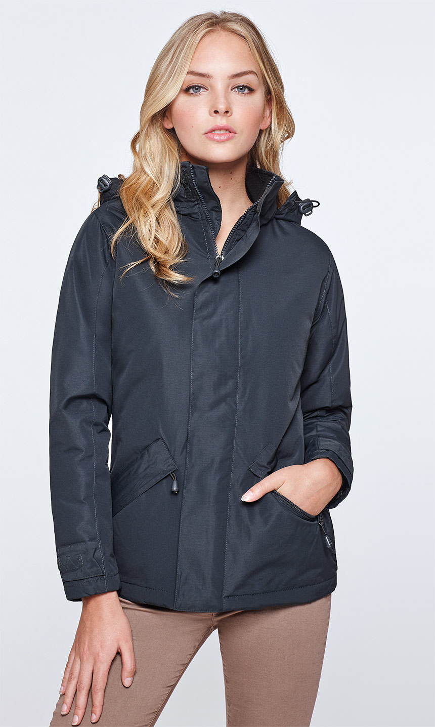 Стилно зимно дамско яке. Два външни джоба с цип, капак и удобен накрайник за отваряне и затваряне. Два вътрешни джоба с велкро затваряне. Регулируеми маншети с велкро и прибираща се регулируема качулка. Лесен достъп за печат или бродерия чрез скрити ципове. От вън е покрито с 100% ветро и водоустойчиво полиестърно покритие.
