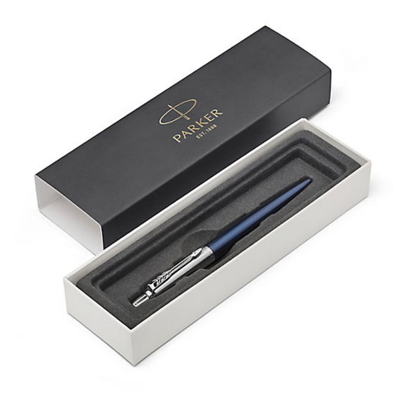 Модернизираната емблематична серия Jotter Royal на Parker е идеалната комбинация от класически стил и функционалност. Тялото е метално с тъмно синьо покритие и стоманена повърхност.