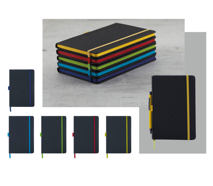 Тефтер A5 с ластик и разделител, 80 листа с редове, цвят на хартията слонова кост с цветен ръб, твърда корица.