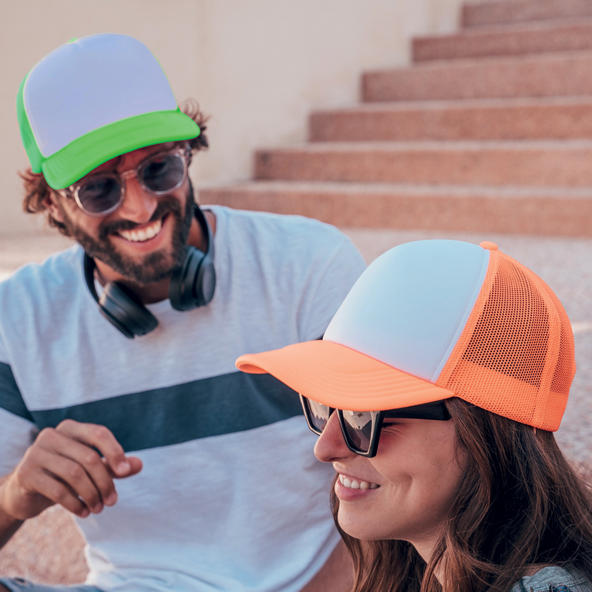 Универсален "TRUCKER CAP" модел с преден панел от полиестерна пяна и странични и задни панели от мрежест материал, задна лента от PVC.