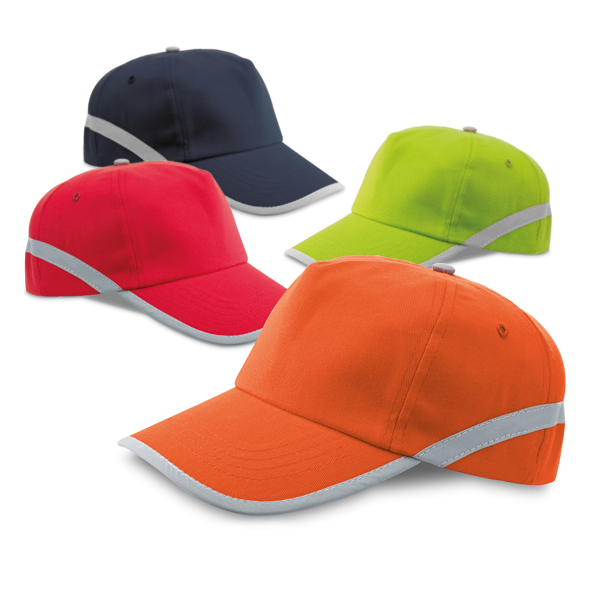 Пет панелна шапка със сива светлоотразителна лента на шапката и козирката. Има два метални вентилационни отвора с цвята на шапката, четири бродирани шева на козирката и е с велкро закопчаване.
