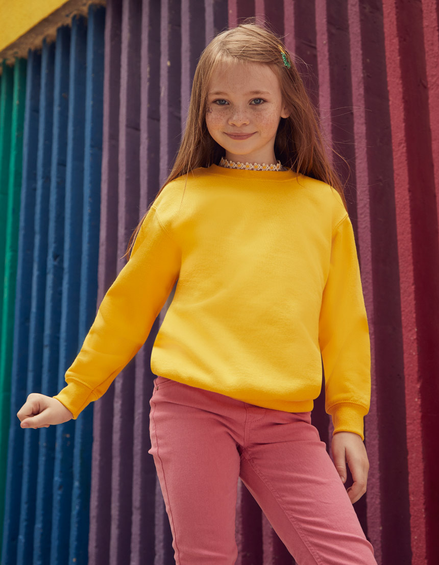 Детска класическа ватена блуза с дълъг ръкав. С двойна подшивка на врата и ластик на ръкавите и кръста. Произведена от Belcoro® прежда за по - контрастен , и стабилен печат.