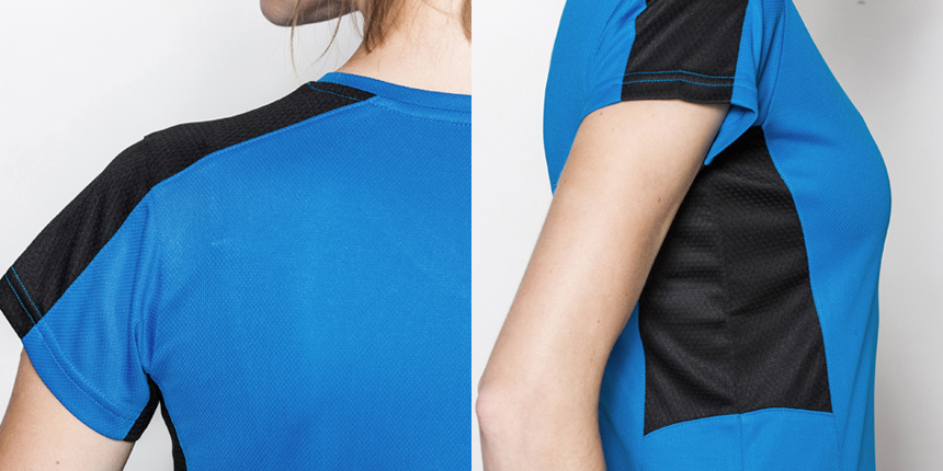 Дамска спортна тениска за сублимация с V деколте и къс ръкав. Тениската е комбинирана с цветни парчета на раменете, ръкавите и под мишниците. Те са от специална дишаща 3D мрежа във формата на пчелна пита, така материята по - добре абсорбира влагата и я извежда към повърхността, където изсъхва по - бързо.