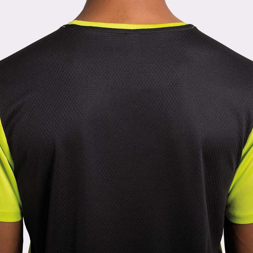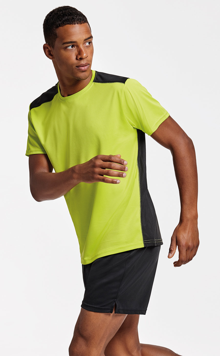 Спортна тениска за сублимация с къс ръкав и контрастни цветове. Тениската е комбинирана с цветни парчета на гърба, рамената и под мишниците. Те са от специална дишаща 3D мрежа във формата на пчелна пита, така материята по - добре абсорбира влагата и я извежда към повърхността, където изсъхва по - бързо. Тениската има декоративни шевове на раменете и отпред, а гърба е по - дълъг от предницата.