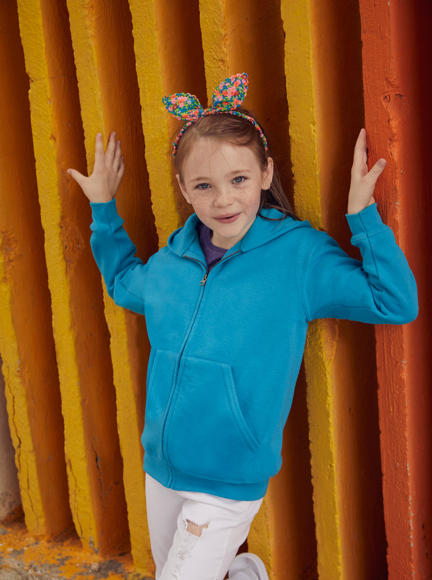 40Детски спортен суитчър от двуконечна вата Classic с джоб тип кенгуру, с двойна качулка и връзки в същия цвят. Суитчъра има цял метален цип ластик на ръкавите и талията . Подходящ за спорт или тренировка в свободното време. Произведен от Belcoro® прежда за по - контрастен , и стабилен печат.