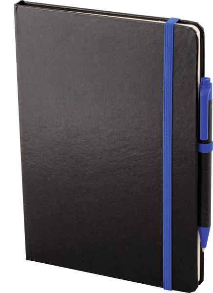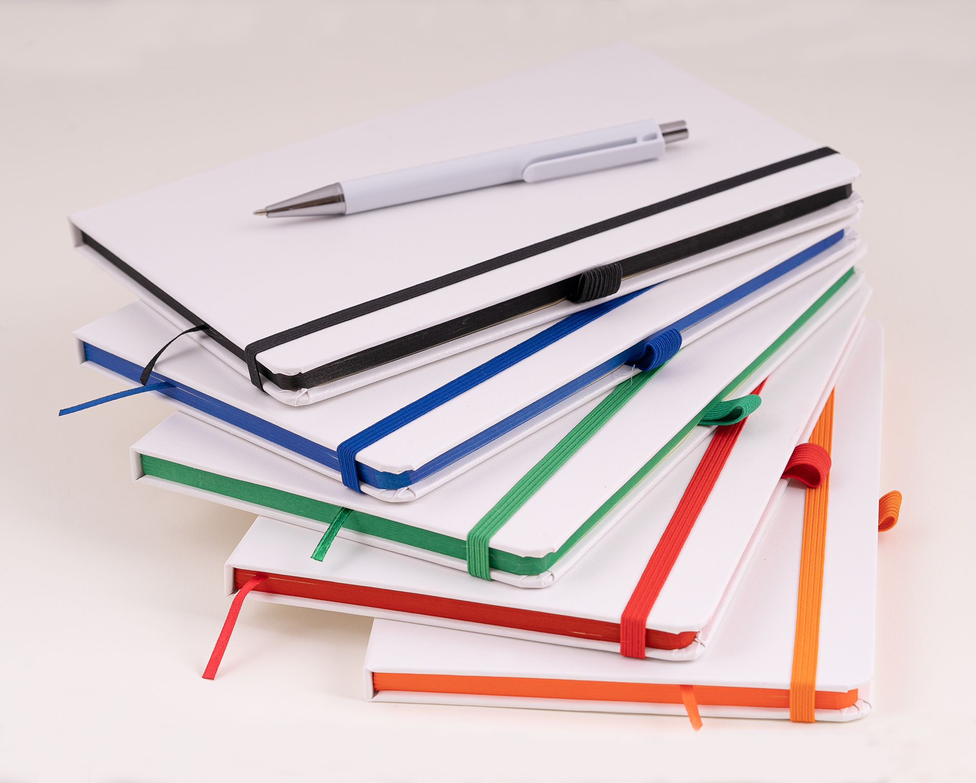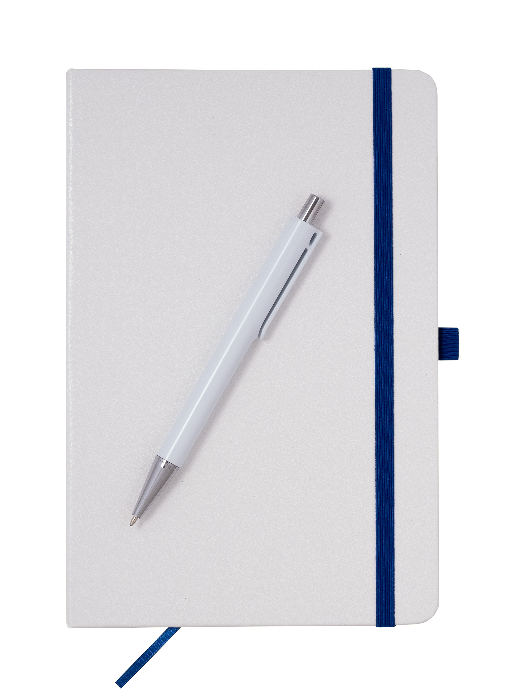 Бял бележник А5 с твърда корица, цветен ластик за химикалка, разделител на страници и ластик за пристягане на страниците. Комбиниран е с бяла пластмасова химикалка, която се съчетава с всеки цвят бележник от този модел. Бележникът съдържа 80 листа на редове с цветни ръбове.