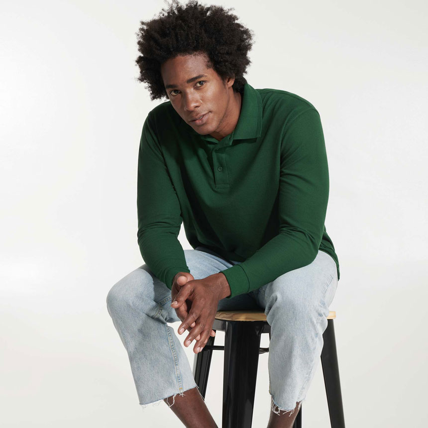 Мъжка риза поло пике от памук и полиестър с дълъг ръкав. Ризата е с три копчета, подсилени шевове и ластик в долната част на ръкава. Идеална комбинация за ежедневния ви външен вид.