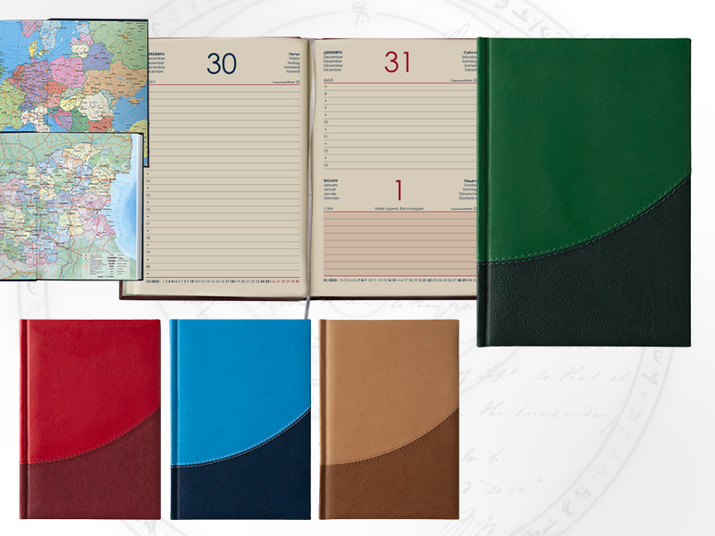 Корица: Луксозна корица от два цвята термоактивна кожа, концево шит и лепен, лице с мека вложка.