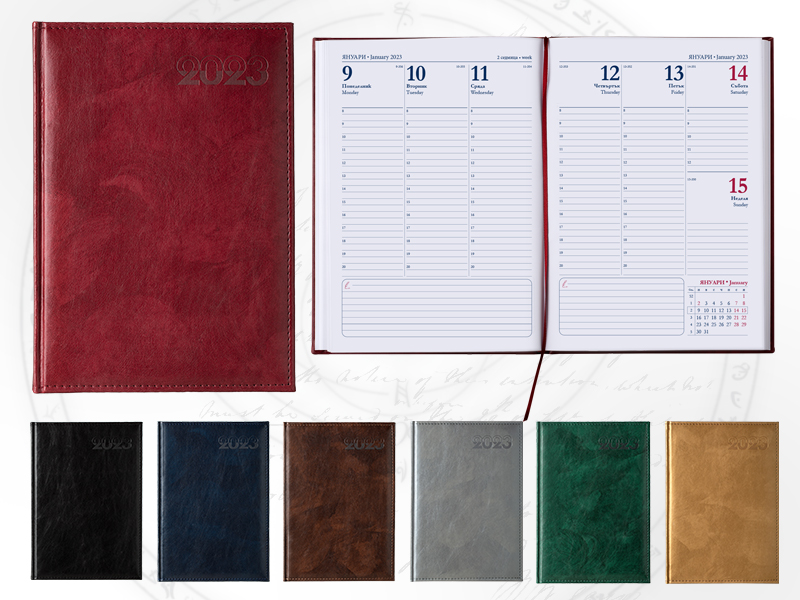 Корица: Луксозна корица от термоактивна кожа със сухо преге, обшит, концево шит и лепен, лице и гръб с мека вложка. Размер:A4 (195/276 мм). Тяло: 144 стр., двуцветен печат, 16 стр. полезна информация, азбучник, текстилна лента за отбелязване.