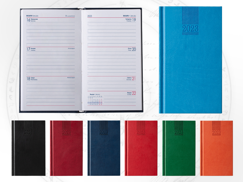 Корица: Луксозна твърда корица облечена с термоактивна кожа със сухо преге, концево шит и лепен. Размер:9/16 см Тяло: 128 стр., двуцветен печат, 16 стр. полезна информация.