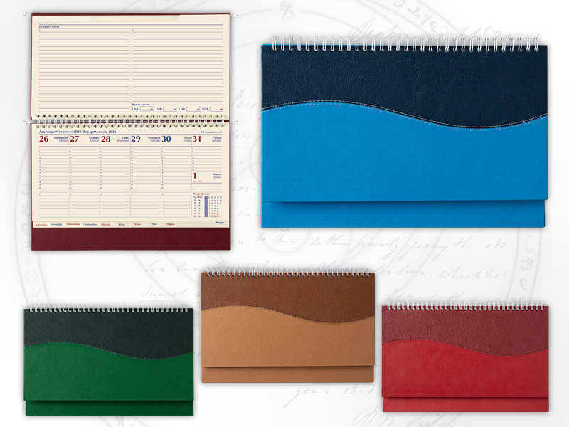 Корица: Луксозна корица от два цвята термоактивна кожа, телен гребен. Размер:30 х 15.5 см Тяло: хартия жълт офсет - 120 стр., двуцветен печат, изрязани маркери по месеци.
