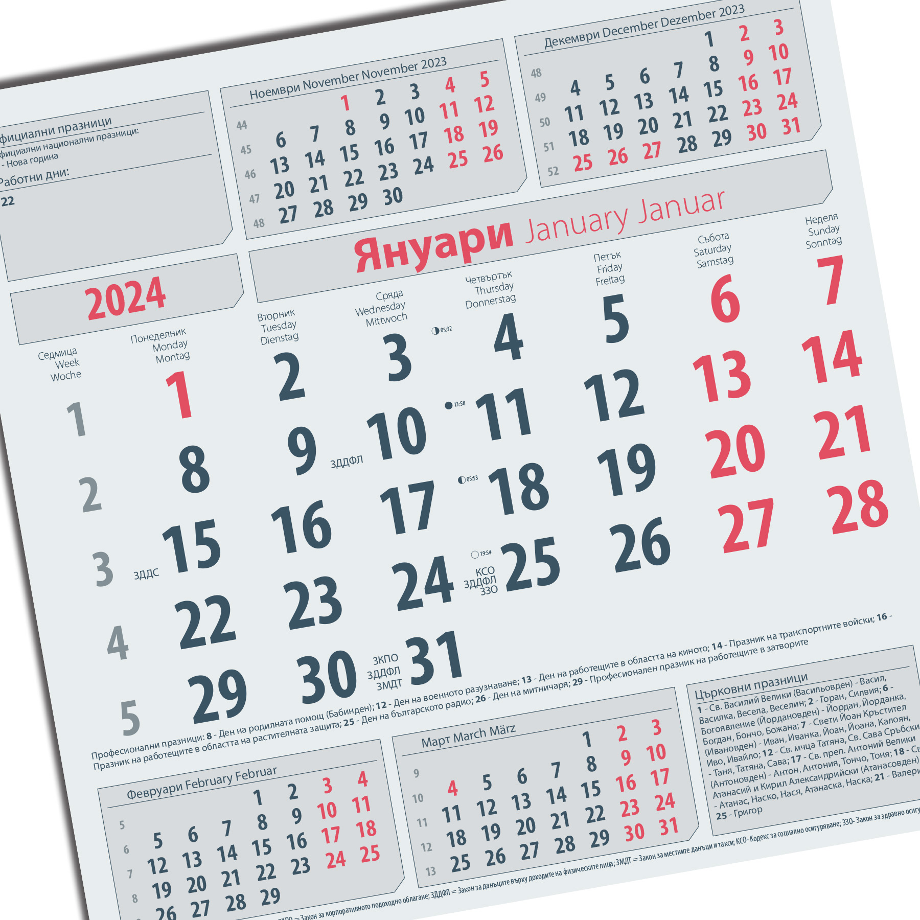 Еднолистовите рекламни бизнес-счетоводни календари, съдържат счетоводна, данъчна и бизнес информация, както следва: