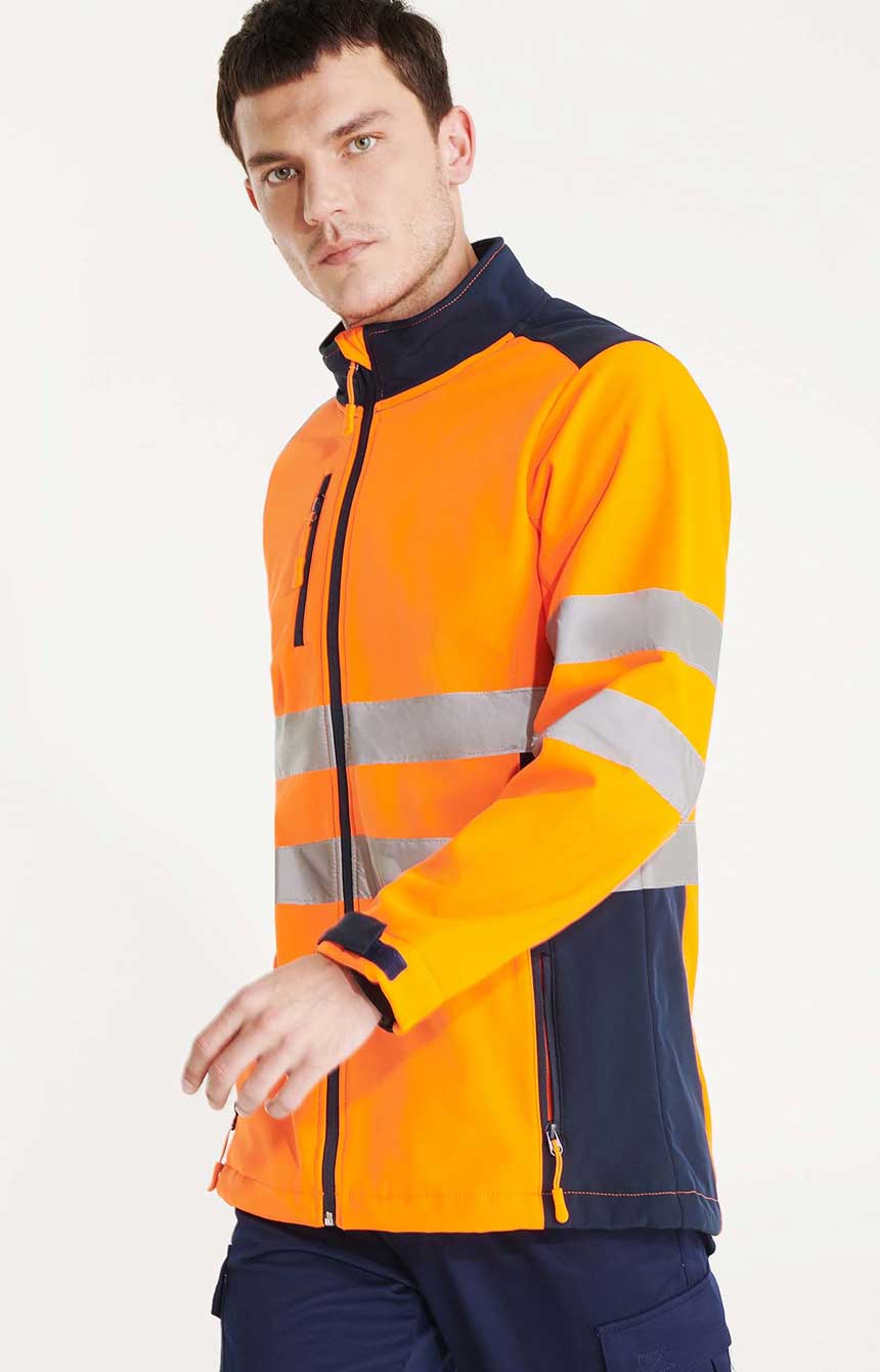 SoftShell двуцветно яке със светлоотразителни ленти за по - добра видимост. Якето е водо и ветроустойчивост. С голямо приложение и отличен външен вид. Якето е двуслойно, отвън мека материя с дишаща повърхност, отвътре микрополарена подплата. Има висока яка, две светлоотразителни ленти на тялото и ръкавите и велкро закопчаване на маншетите. В долната му част има ластична лента дължината на която може да се регулира. Ширината на маншетите също е регилируема с велкро. Якето е с пет джоба три външни с водоустойчиви ципове и два вътрешни. Якето е сертифицирано по CE съгласно стандартите: