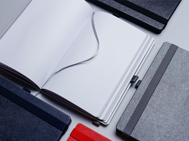 Бележник A5 със заоблени ъгли, ластик, ластик за химикалка и джоб от вътрешната страна на корицата.