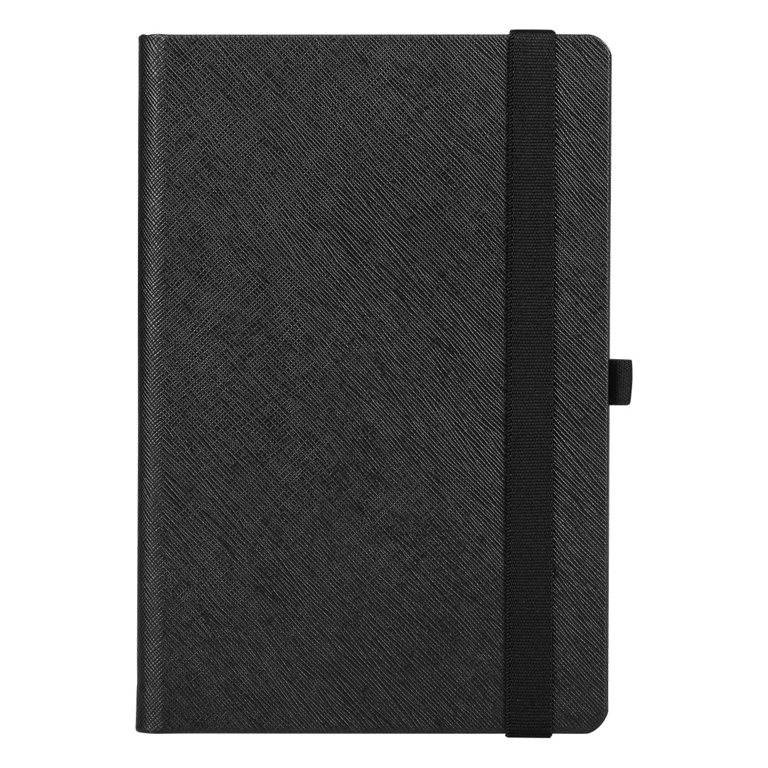 Бележник A5 със заоблени ъгли, ластик, ластик за химикалка и джоб от вътрешната страна на корицата.