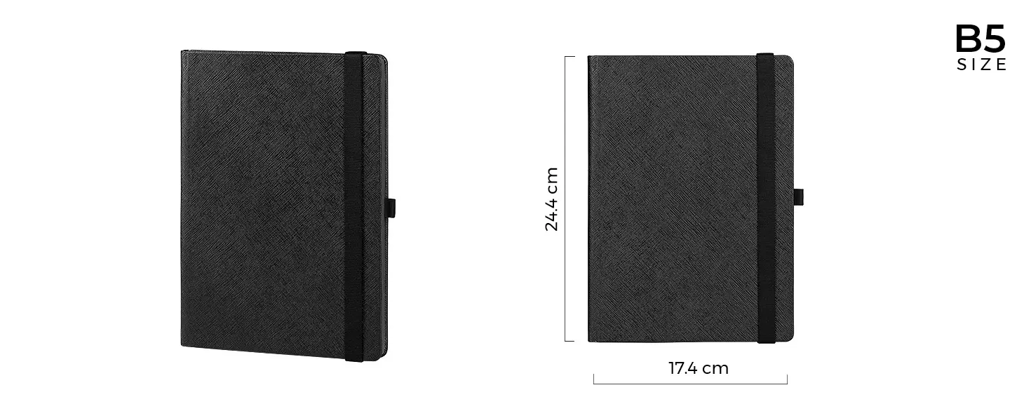 Бележник във формат B5 със заоблени ръбове, блок печат в тон с цвета на корицата, ластик, място за химикалка и джоб на вътрешната част на корицата.
