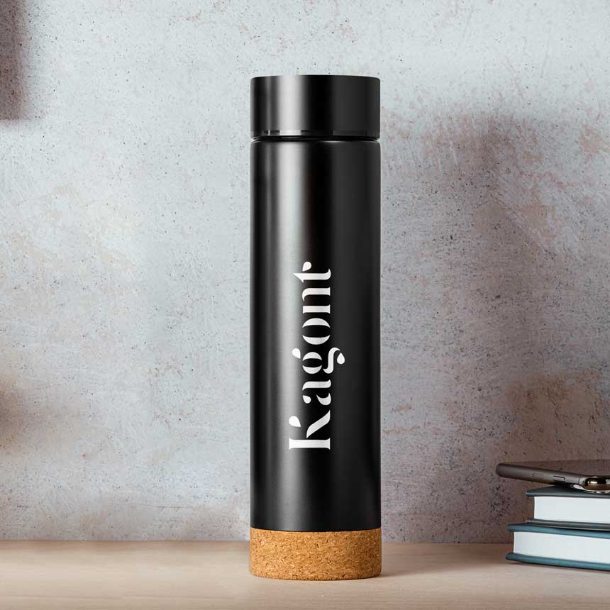 Двустенна термо бутилка от стомана 304 с филтър за чай и коркова основа. Капацитет 460 мл.