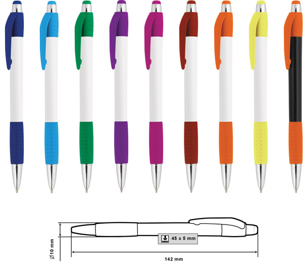 Химикалка, пълнител обикновен. Материал: пластмаса. Размер на артикула: Ø10х142 mm. Печатаемо поле: 45х5 mm Печат: тампонен, ситопечат. Опаковка: 50 бр. в кутия/1000 бр. в кашон. При поръчка, количеството да е кратно на 50 бр.