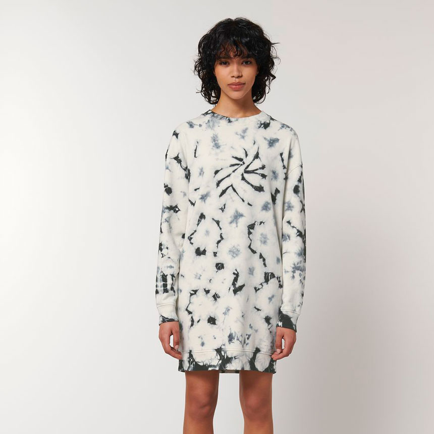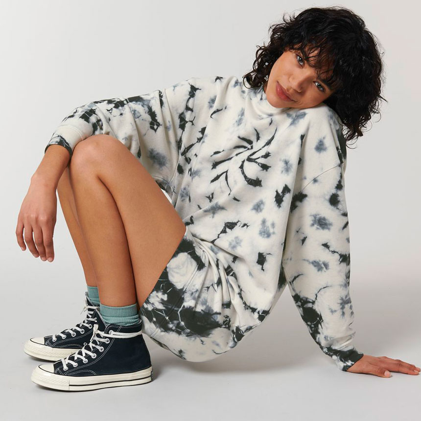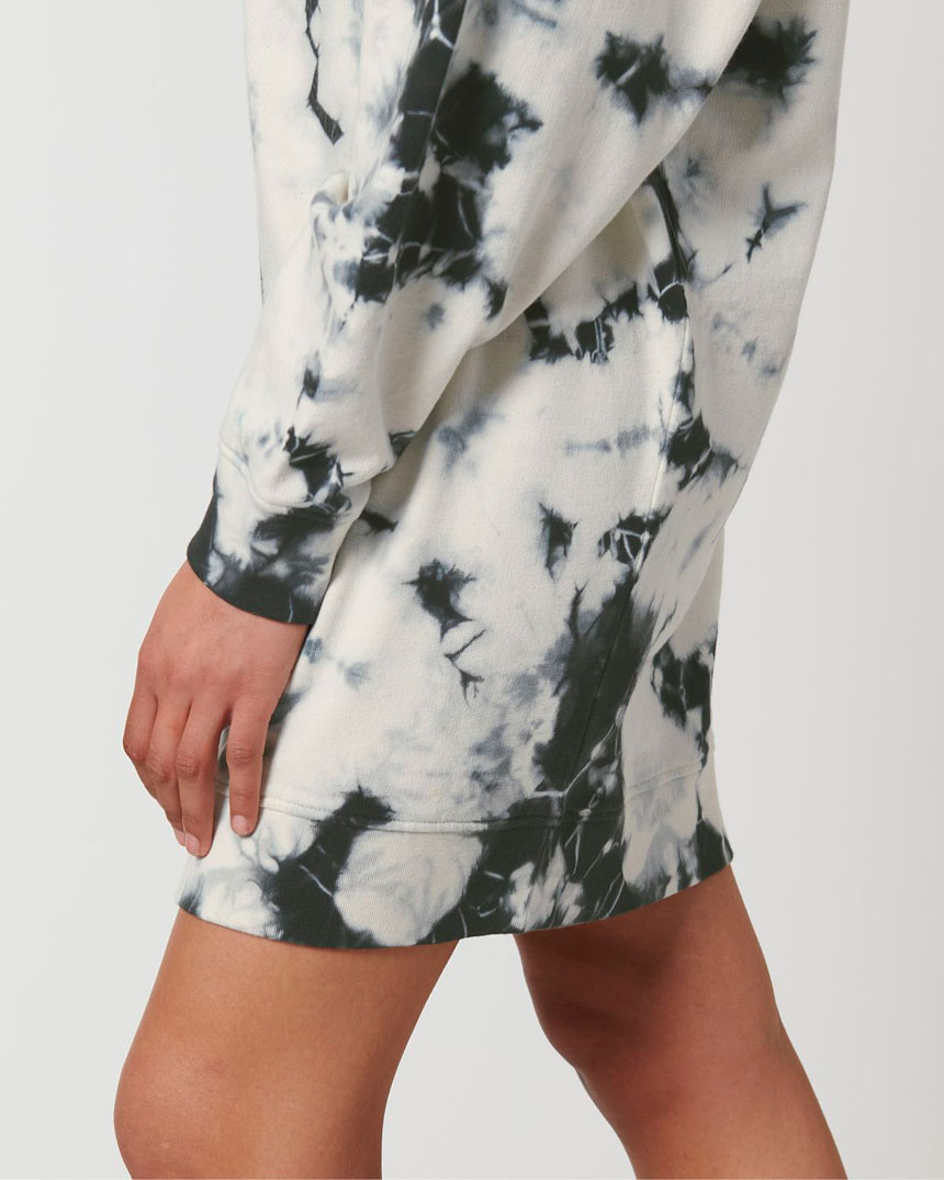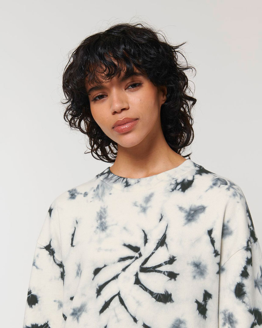 Блузата е, избагрена с Tie- dye техниката за ръчно боядисване Всяка блуза е с уникална шарка и излъчване.. Всички шевове на блузата са тип Flatloc topstitch. Тя е от фин органичен пениран памук с плътност (300гр.м2) примесен с 15% полиестер за издържливост при пране.