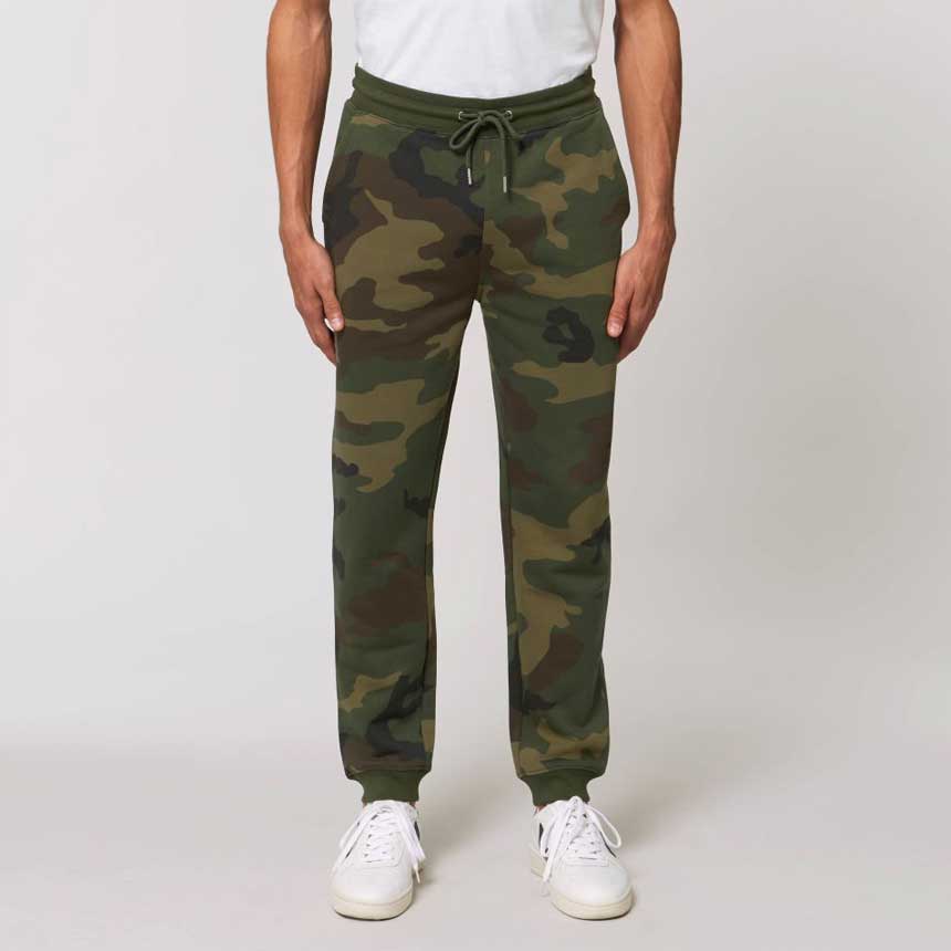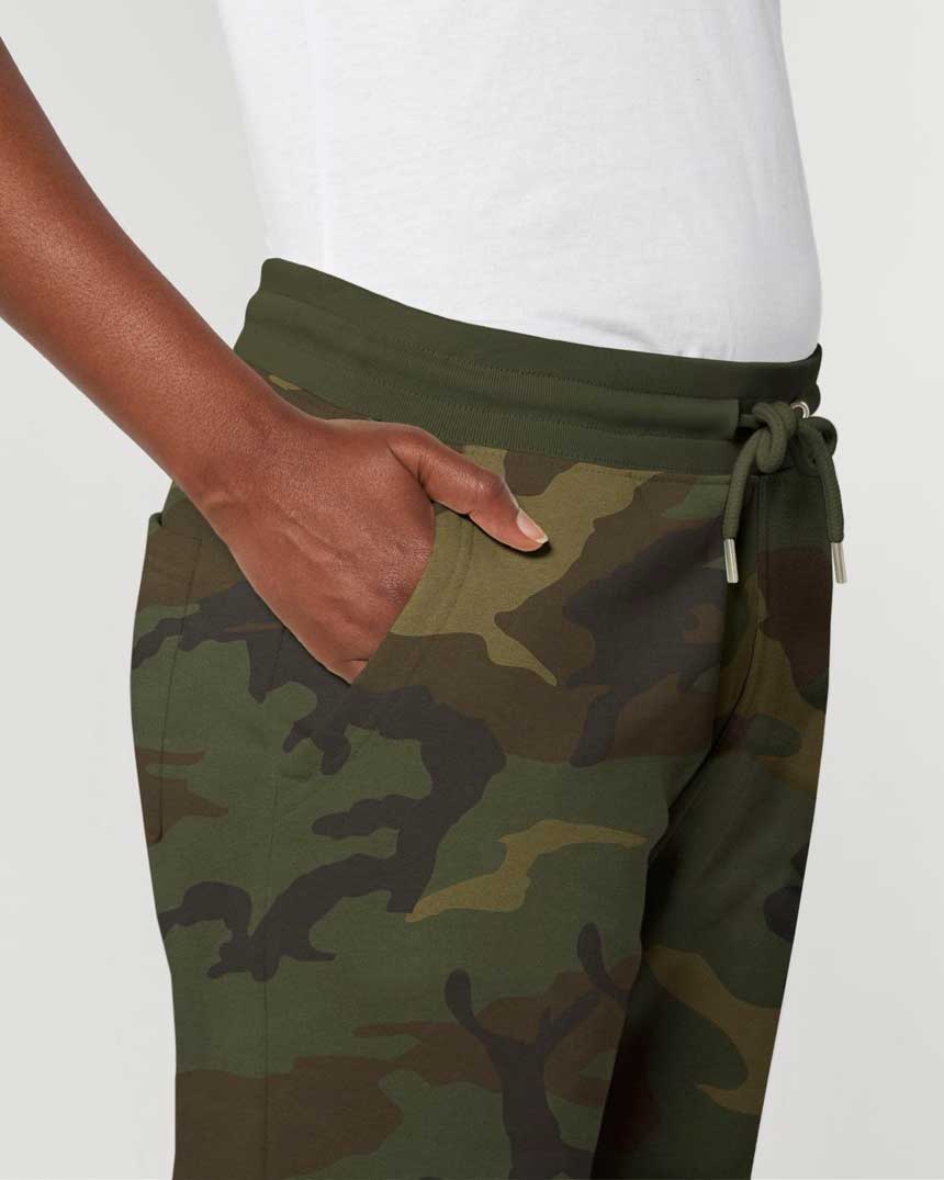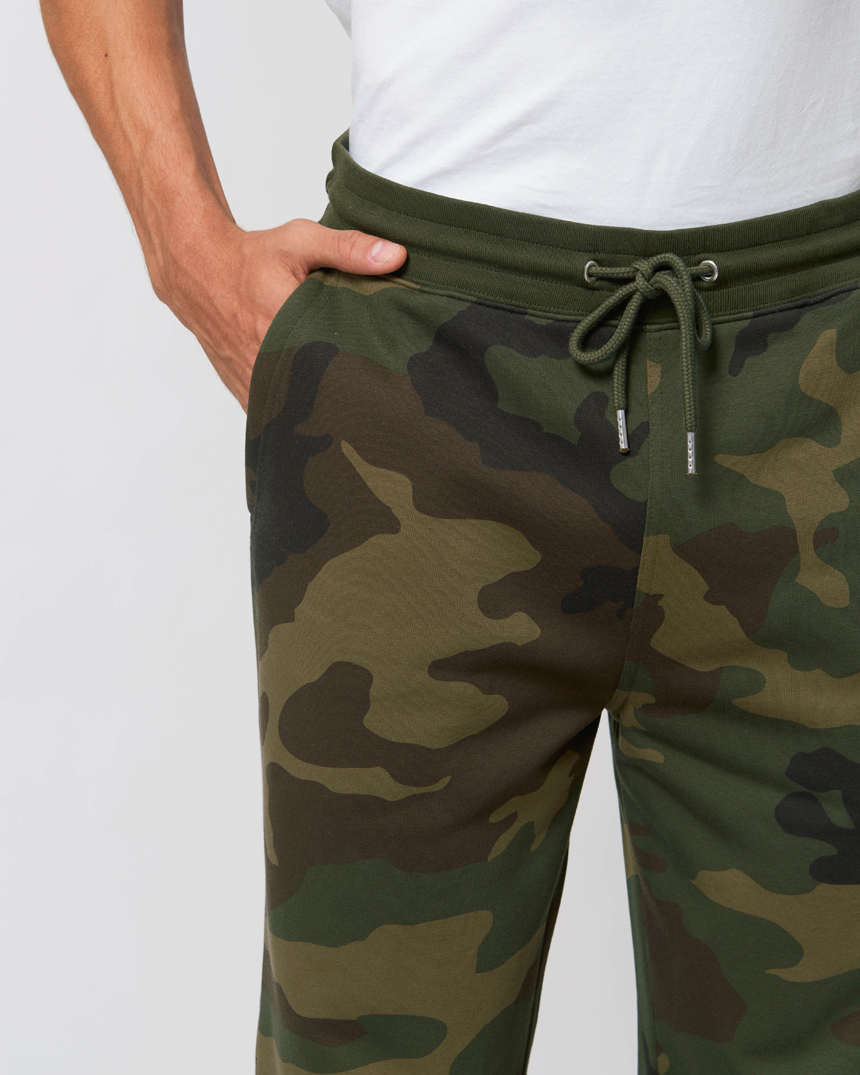 Камуфлажно унисекс спортно долнище от изключително мека и гладка вата. То е модерно, с широк колан, който се регулира с връзки и ластик. Има ластик на глезените, два странични и един заден джоб. Ватата е плътна (300гр.м2) и е от фин органичен пениран памук примесен с 15% полиестер за издържливост при пране.
