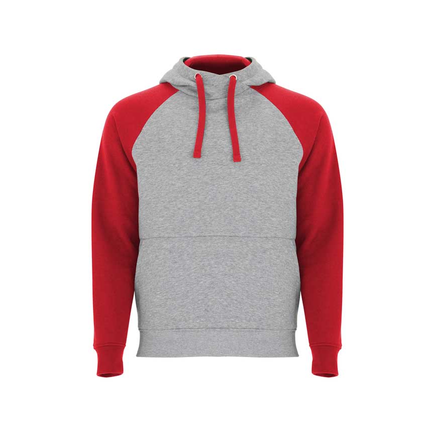 Двуцветен детски суичър подходящ за момчета и момичета. Качулка с кръстосана яка, контрастна възка и метални капси. Ръкавите на суитчъра са контрастни. Джоб в стил кенгуру и широк ластик на талията и маншетите.