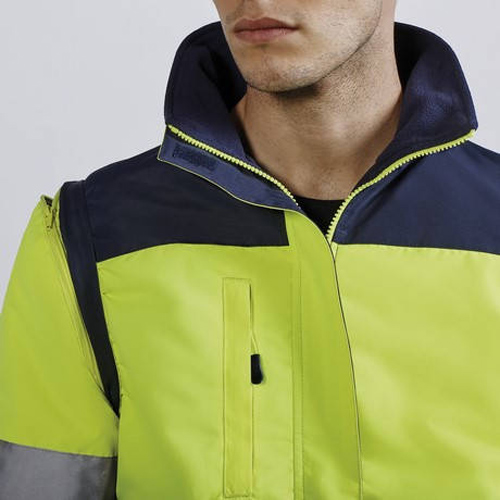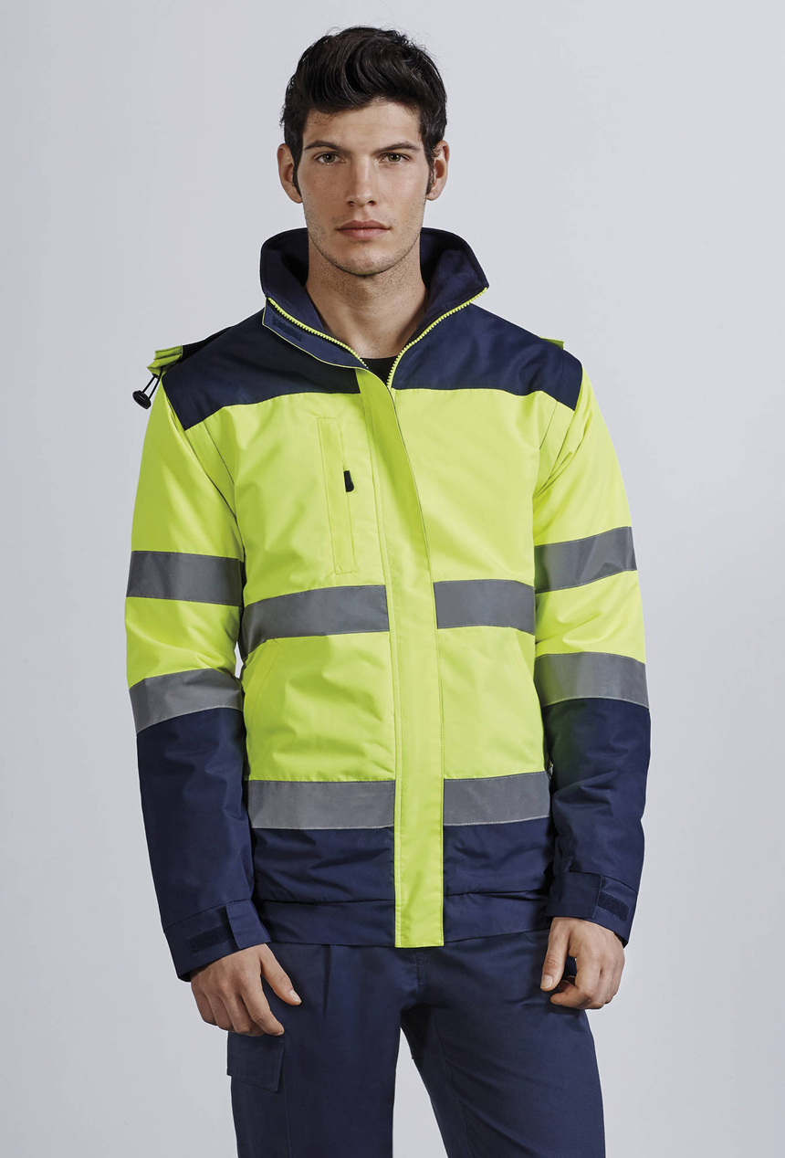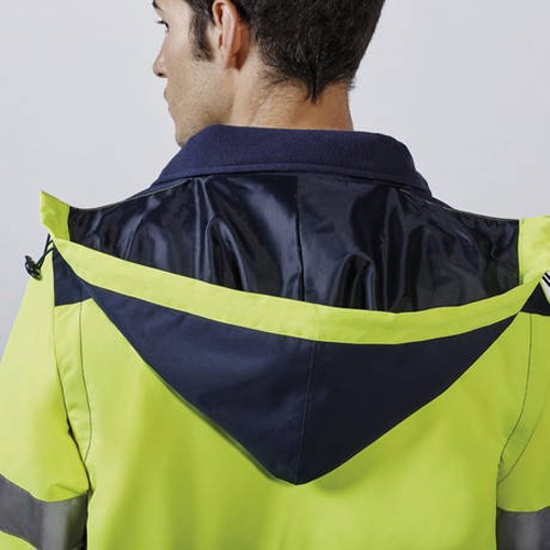 Мъжко двуцветно яке със светлоотразителни ленти на тялото и ръкавите за по - добра видимост. Якето е с висока яка, качулка и свалящи се ръкави. Има два наклонени и лесно достъпни предни джобове, както и един отпред с цип. Ширината на талията, маншетите и качулката също са регулируеми. Има вътрешен джоб на гърдите и вътрешен цип за лесен достъп за печат или бродиране. Якето е сертифицирано по CE съгласно стандартите: