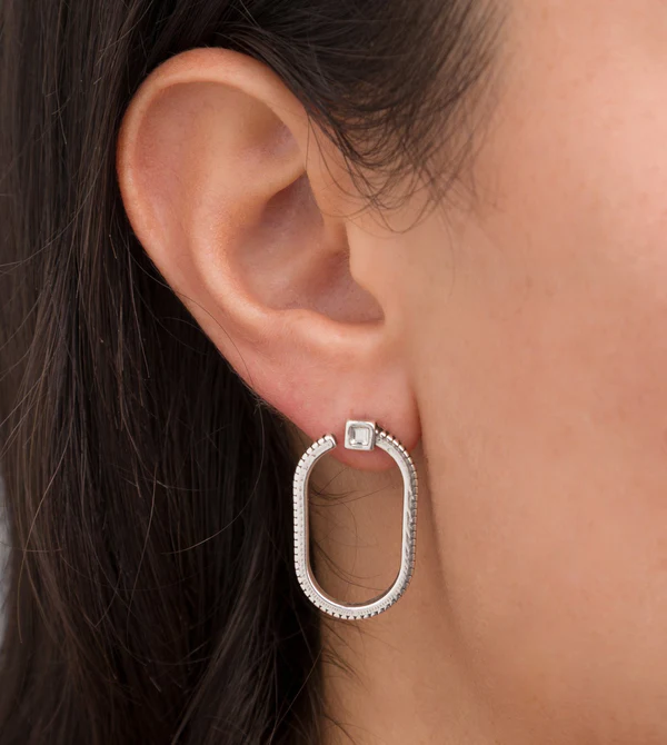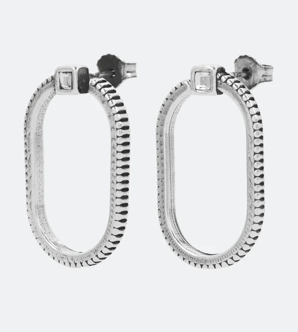 Елегантни и оригинални са тези обеци с халки! Овалната форма на обръч пада отпред, с назъбена текстура, която й придава уникално докосване. Има закопчалка на винт, а последният щрих е малко блясък, така че не пропускайте своя!