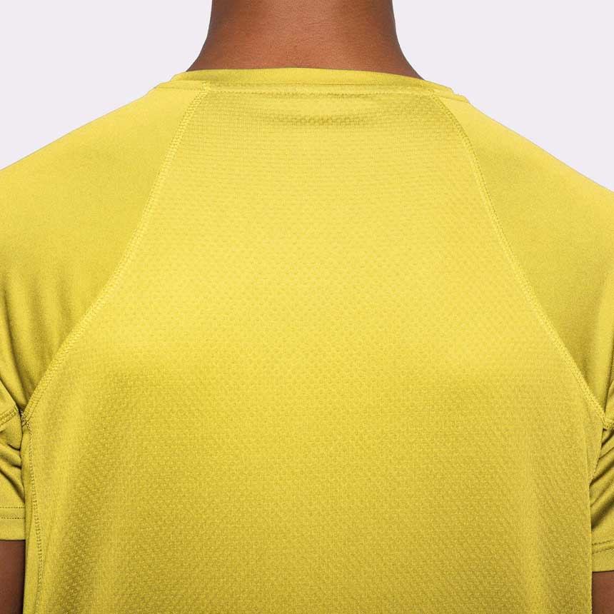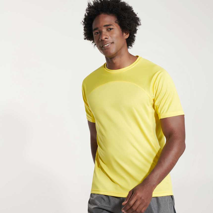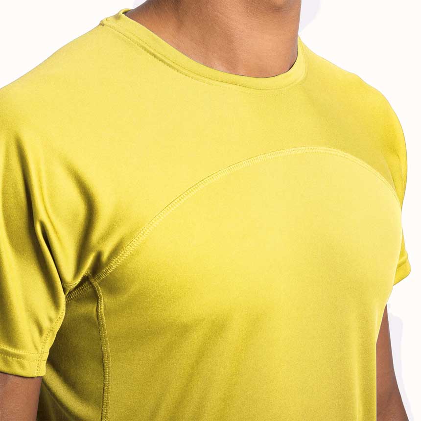 Унисекс спортна тениска за сублимация с къс ръкав подходяща за всички видове спорт. Тениската е комбинация от две полиестерни дишащи материи. Отпред и ръкавите гладка и мека на допир, гърба специална дишаща 3D мрежа във формата на пчелна пита, така че по - добре да абсорбира влагата и да я извежда към повърхността, където изсъхва по - бързо. Тениската има декоративни шевове отпред и под мишниците, а потната лента в деколтето е жълта и контрастна.