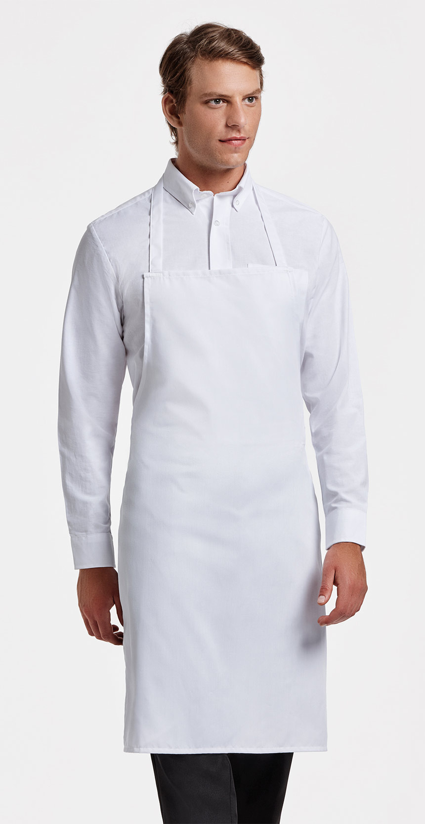 Дълга престилка с лента на врата. Престилката се захваща на талията с две връзки. Моделът е подходящ за работа в кухня, складове, магазини, детски заведения и др. Материята на плата гарантира лесно пране, гладене и бързо съхнене.