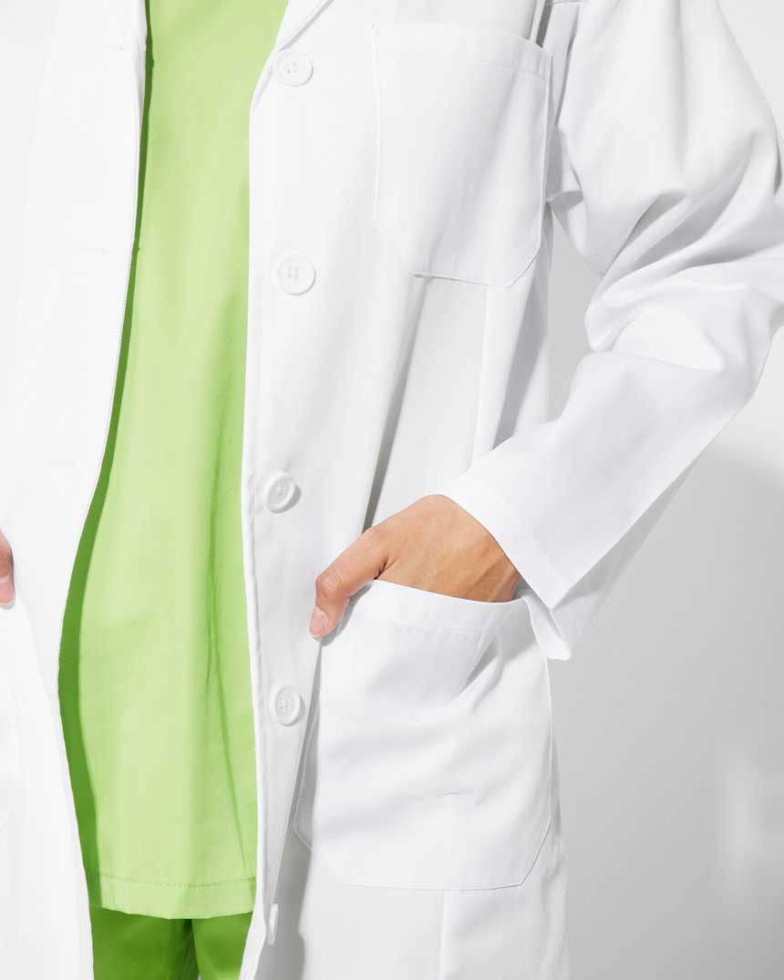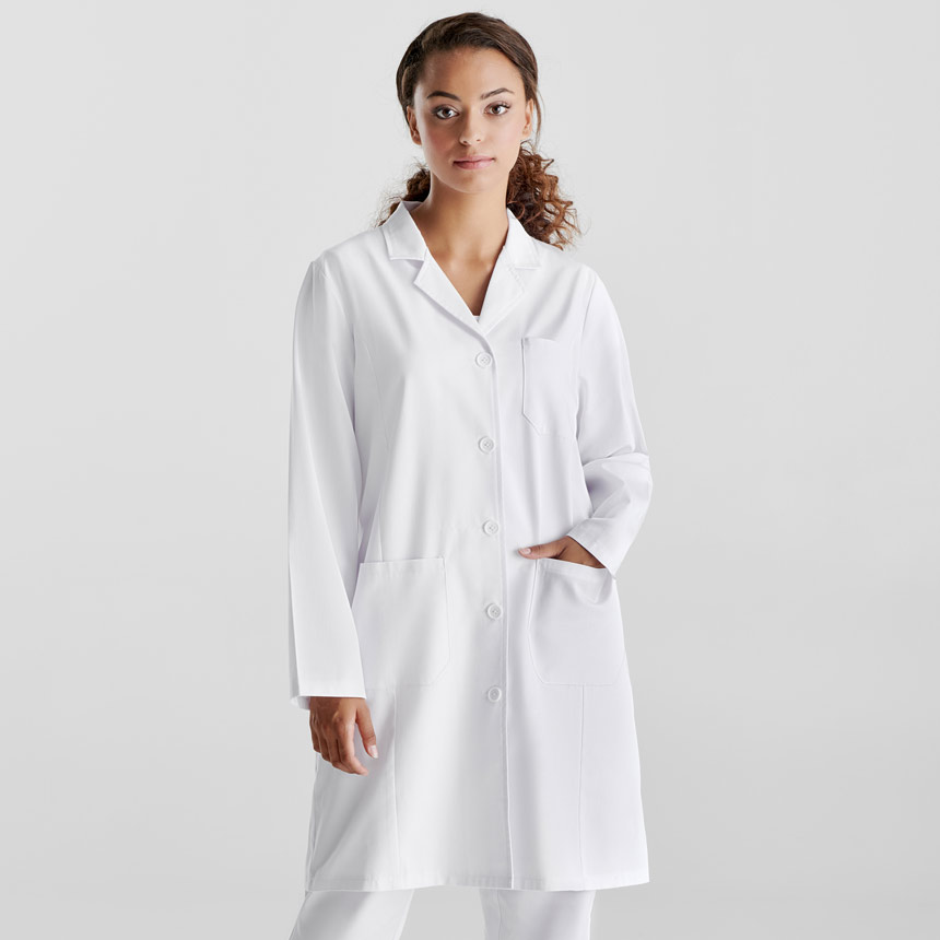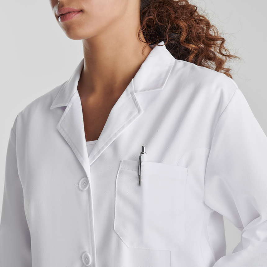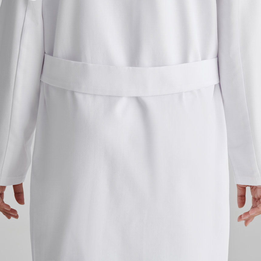 Дамска вталена медицинска престилка с дълги ръкави. Престилката е с пет копчета, два странични джоба и един на сърцето. На талията отзад има колан.