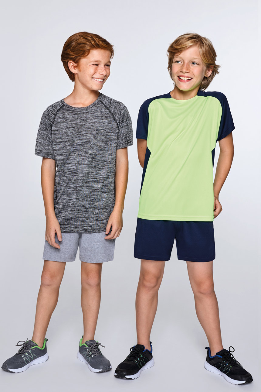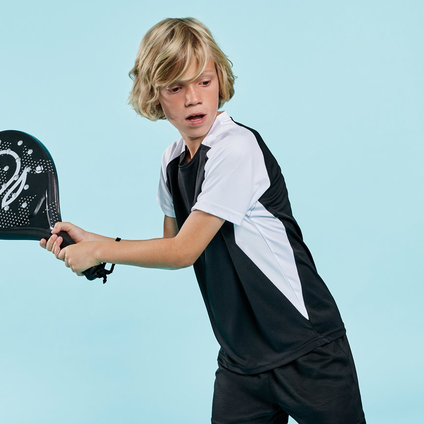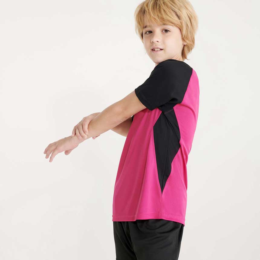 Тениска от гладка полиестерна материя абсорбираща влагата за пълноцветен сублимационен печат. Тя е комбинация от два цвята и е декорирана с цветни парчета на рамената, ръкавите и под мишниците. Тениската е подсилена в деколтето и раменете.