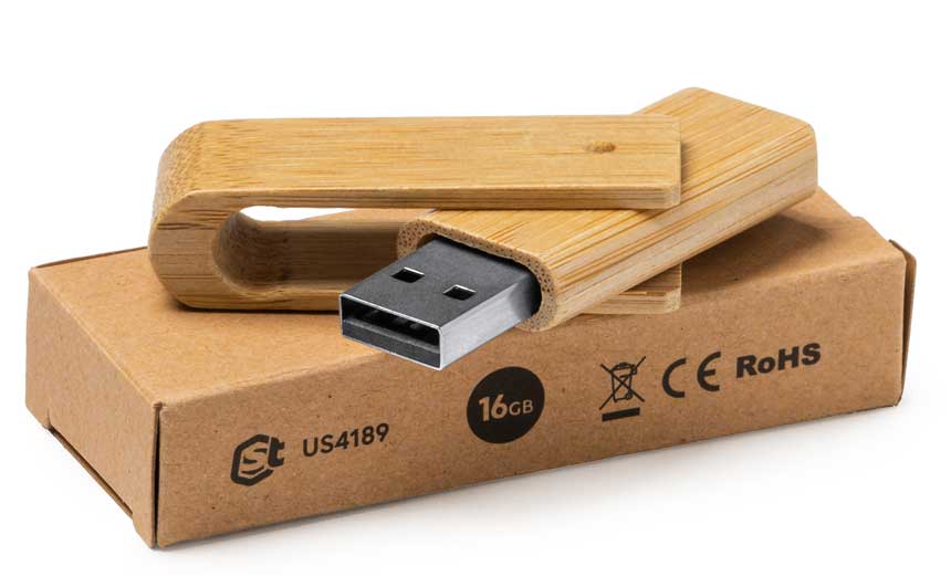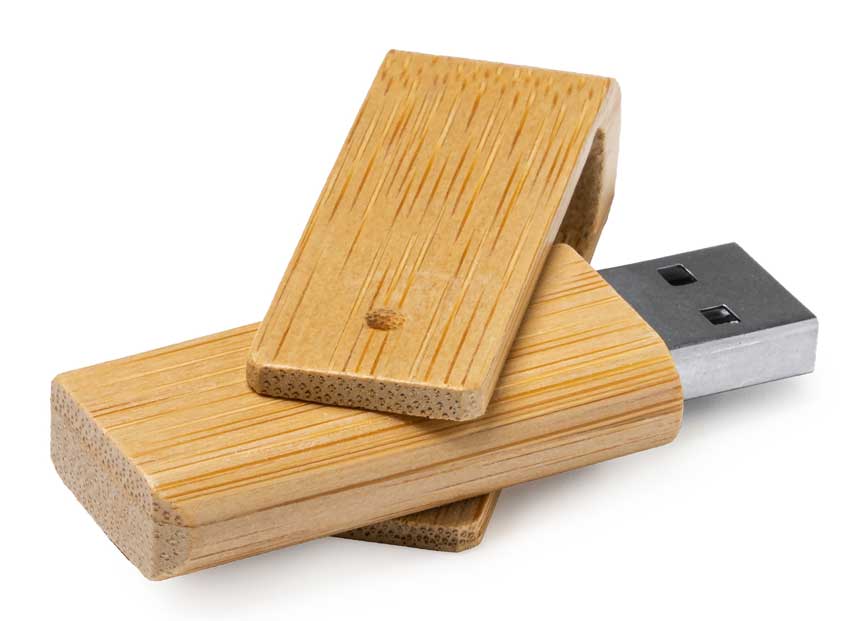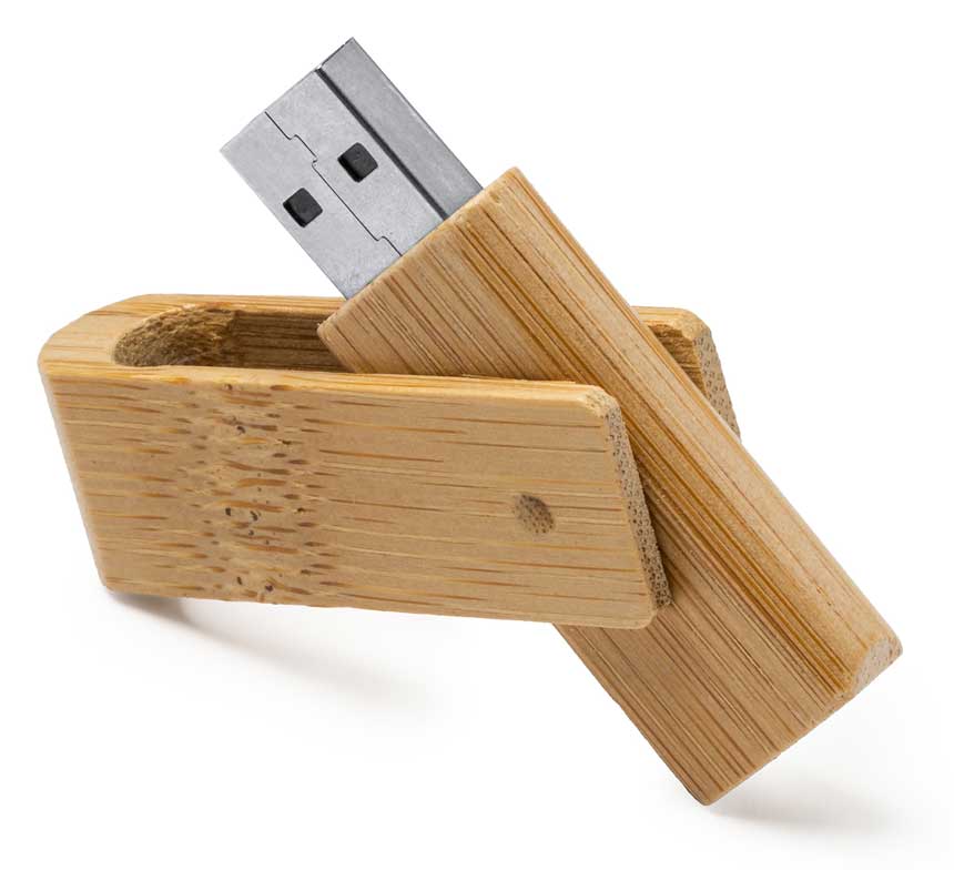USB памет с корпус и въртяща се стойка, изработена от естествен бамбук. 16GB капацитет.