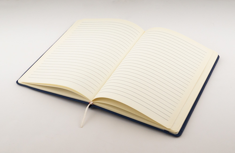 Тъмносин рекламен бележник с твърди, гумирано покритие DITTO SOFT. Бележникът е с размер А5 (14х21 см) и съдържа 80 тонирани листа на редове.